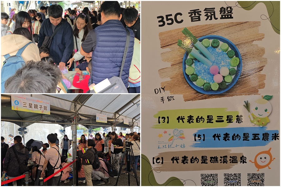 親子館攤位更是人氣滿滿,其中三星、五結、礁溪親子館,結合三星蔥、五農米、礁溪溫泉三大地方特色設計的35C香氛盤,因為太受歡迎,600份材料包很快就被領取一空;壯圍和南澳親子館則以人臉彩繪與民眾互動。