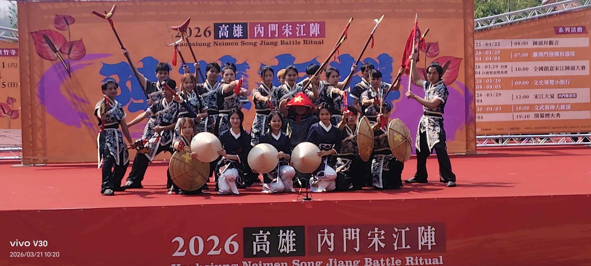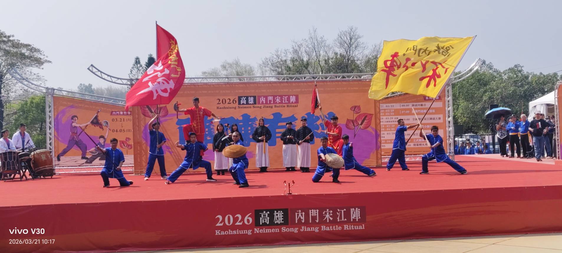 開幕典禮以「青刀巷」儀式隆重登場,象徵最高規格的迎賓禮遇,展現內門藝陣文化的莊嚴與熱情。來自各地的藝陣隊伍齊聚一堂,由宗興武藝創意宋江陣、中埔埤仔墘宋江獅陣及實踐大學高雄校區越南學生組成的隊伍帶來精彩尬陣演出,融合傳統武藝與創意元素,呈現跨文化交流的新風貌。