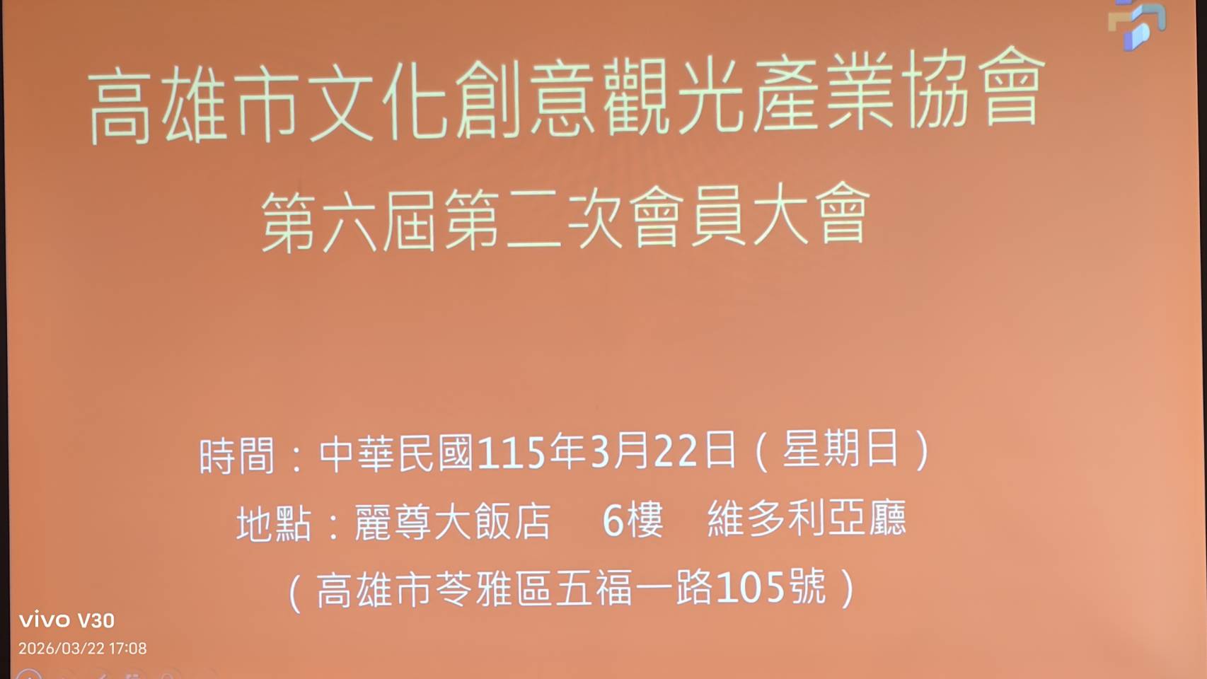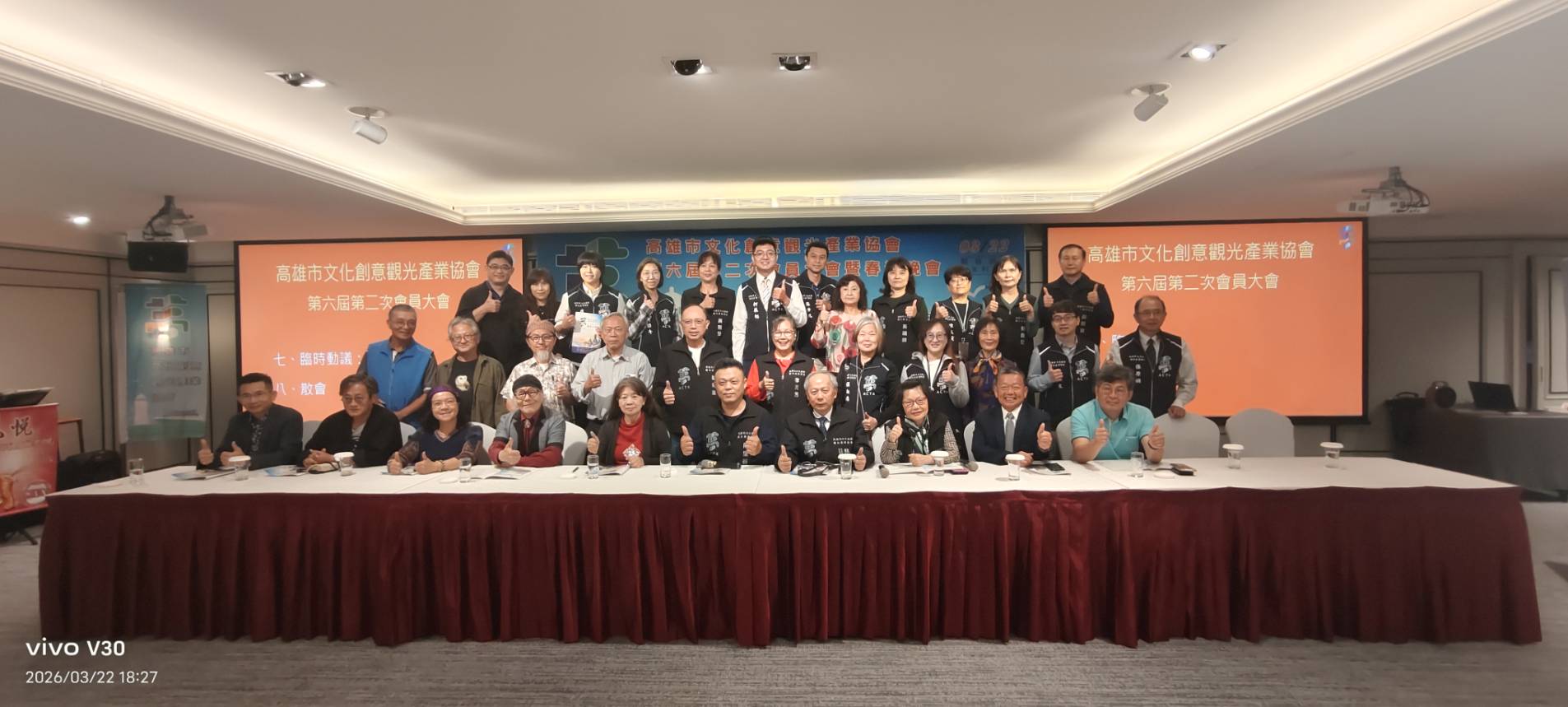 高雄市文化創意觀光產業協會於3月22日在麗尊大飯店舉行「第六屆第二次會員大會」,匯聚理監事、會員與各界顧問齊聚一堂,回顧年度成果並擘劃未來藍圖。會議結合專題講座與藝文展演,不僅展現文化創意產業的多元面貌,也凸顯跨界整合與地方連結的重要性,為高雄文化觀光發展注入新動能。