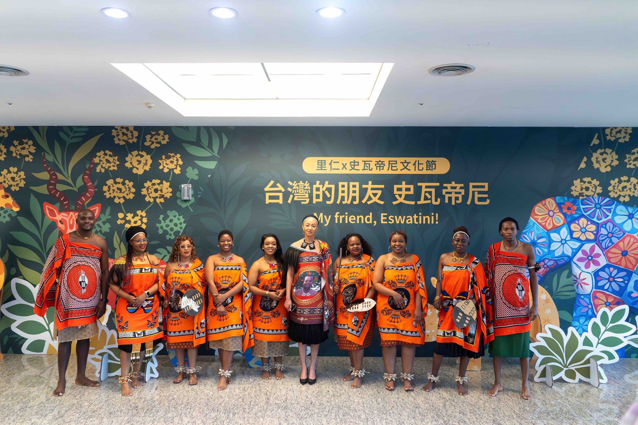 ▲史瓦帝尼王國大使館一等秘書Ms. Abbigail Pieterse(右5)與在台史瓦帝尼學生,以史國傳統文化。(圖/里仁公司提供)