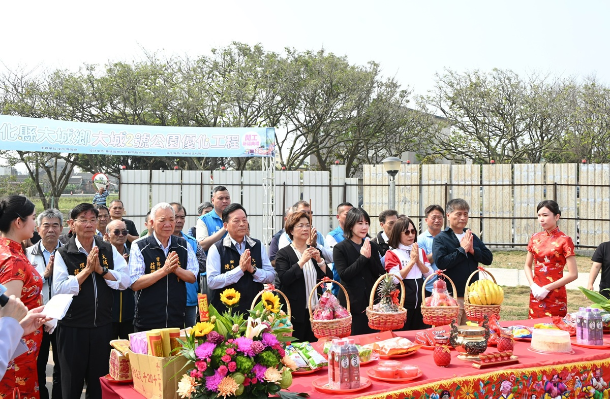 彰化縣府團隊近年積極推動「一鄉鎮一特色公園」,目前已完成16座共融式特色公園,位大城鄉大城2號公園遊戲場工程於今(24)日舉辦開工動土典禮,由縣長王惠美主持。工程內容以「追風COOL樂園」為主題,期盼打造孩童遊憩、鄉親運動及環境共融的特色遊憩場域。王縣長表示,感謝議長謝典霖及所有議員對預算的支持,本工程位於大城2號公園,與大城運動公園相鄰,縣府去年與大城鄉公所合作,完成基地綠地營造並新建「感風攀場」地景遊戲場。本次縣府再加碼編列工程費2,200萬元,工期210日曆天,期盼提供給鄉親更舒適的休憩空間。