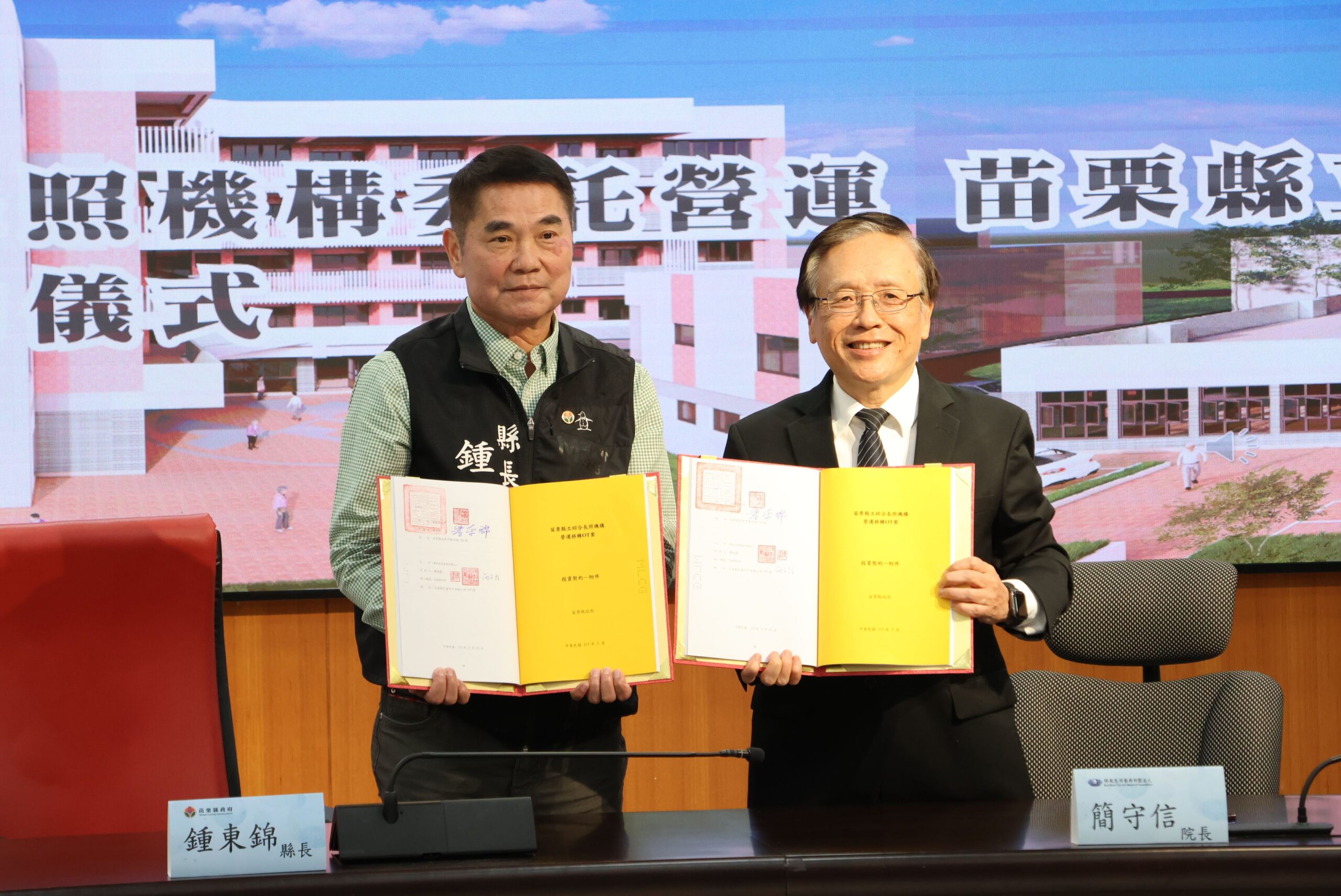 苗栗縣立長照醫養家園3月初動土開工,同時以促參法辦理公開招標,由佛教慈濟醫療財團法人獲選為最優申請人,3月25日苗栗縣長鍾東錦與台中慈濟醫 長簡守信進行苗栗縣立綜合長照機構委託營運簽約儀式,啟動公私協力照顧鄉親晚年生活,工程預計117年10月完工,確保未來工程完工後即可無縫銜接服務,讓長輩照顧不中斷。