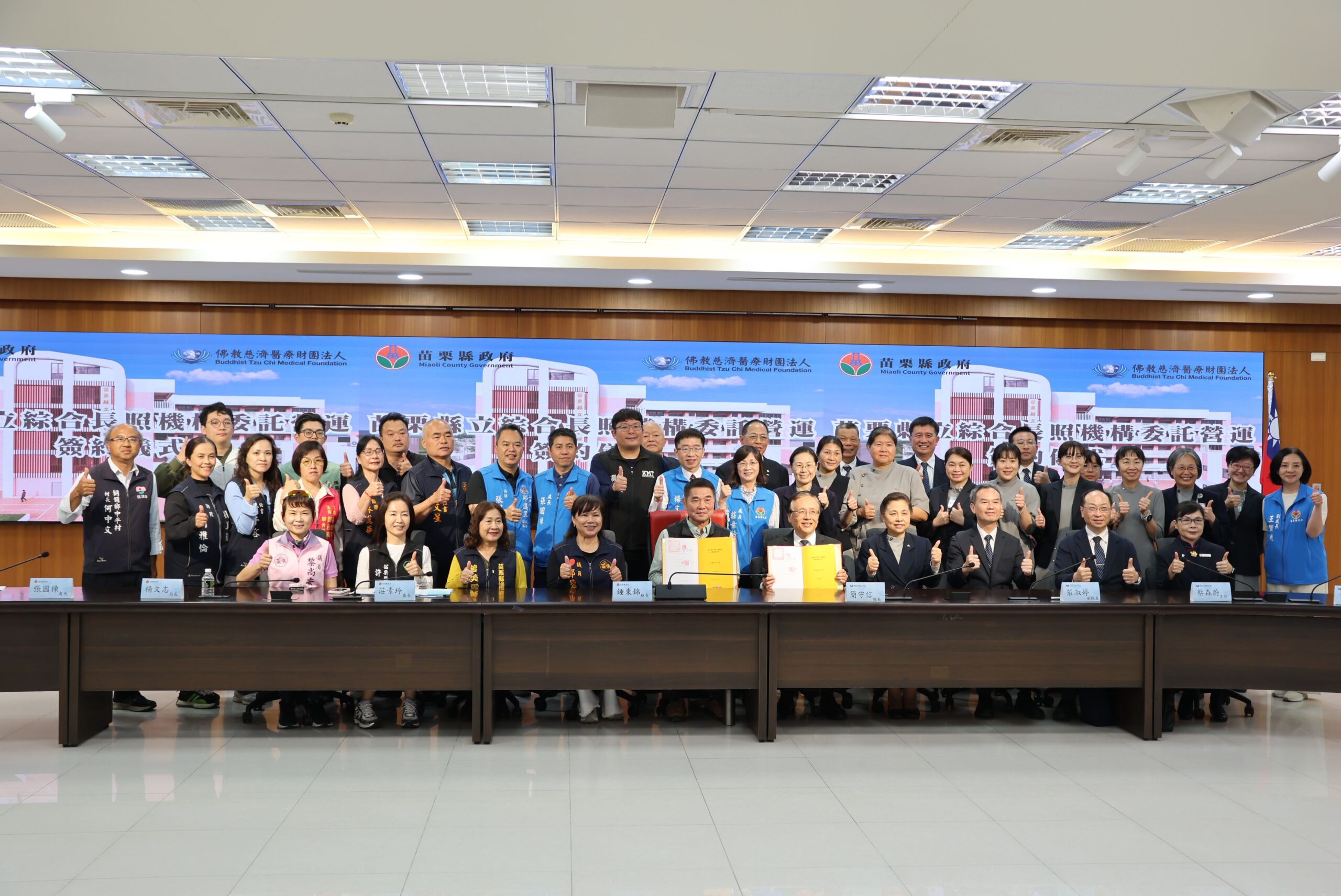 25日苗栗縣立綜合長照機構委託營運簽約儀式於縣府4樓會議室隆重舉行,縣長鍾東錦率長照處長莊素玲、衛生局長楊文志、社會處長張國棟與台中慈濟醫院長簡守信簽約,台中慈濟醫院副院長莊淑婷及慈濟團隊、議員鄭碧玉、許櫻萍、曾美露、黎尚安、楊明燁、立委邱鎮軍助理、議長李文斌秘書、各議員助理等人也等場見證這場盛會。