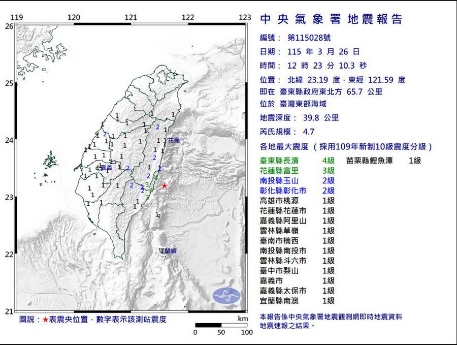 今天3月26日12時23分10秒,臺灣東部海域發生芮氏規模4.7有感地震,震央在臺東縣政府東北方65.7公里處,地震深度39.8公里,氣象署即時地震資料顯示,臺東縣長濱及成功最大震度4級,東河3級,池上、海端、利稻2級,鹿野、綠島、卑南、蘭嶼都是1級。