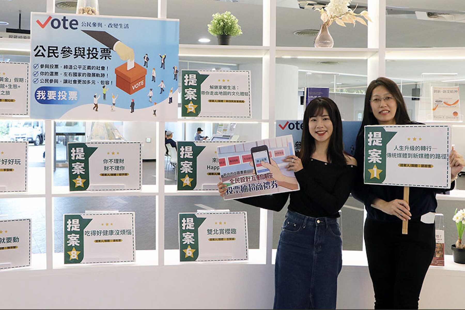 新北市「全民設計互動系列講座」共有9項提案進入票選,包括職涯轉型與自我成長的「人生升級的轉行(傳統媒體到新媒體的路徑)」、「跑出舒適圈,發現更好的自己」;投資理財的「你不理財,財不理你」;健康生活的「要活就要動」、「吃得好健康沒煩惱」;多元文化的「解鎖家鄉生活—帶你走出地圖的文化體驗」;以及休閒旅遊的「花季好好玩」、「新北一日『黃金』假期」、「雙北賞櫻趣」等,3月27日至4月15日止開放全民票選,歡迎大家到「新北市政府公民參與網路投票系統」進行線上投票,參加投票還可以抽100元超商禮券。詳細資訊請至新北市立圖書館網站查詢(http://www.library.ntpc.gov.tw)。