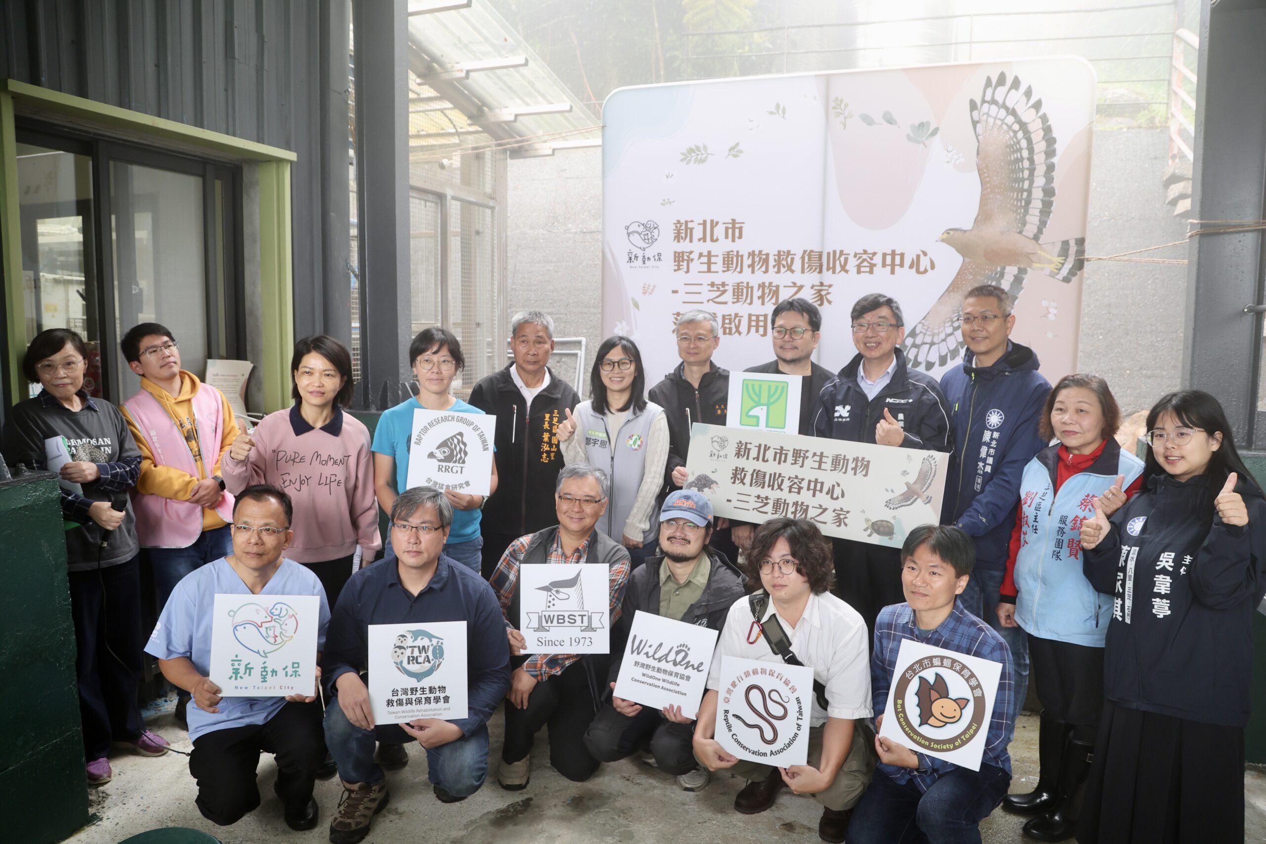 ▲農業局長、三芝區長、里長及議員、台灣猛禽研究會、台北市野鳥學會、台北市蝙蝠保育學會、台灣野生動物救傷與保育學會、臺灣爬行類動物保育學會及野灣野生動物保育協會獻上祝福。(圖/新北市動保處 提供)