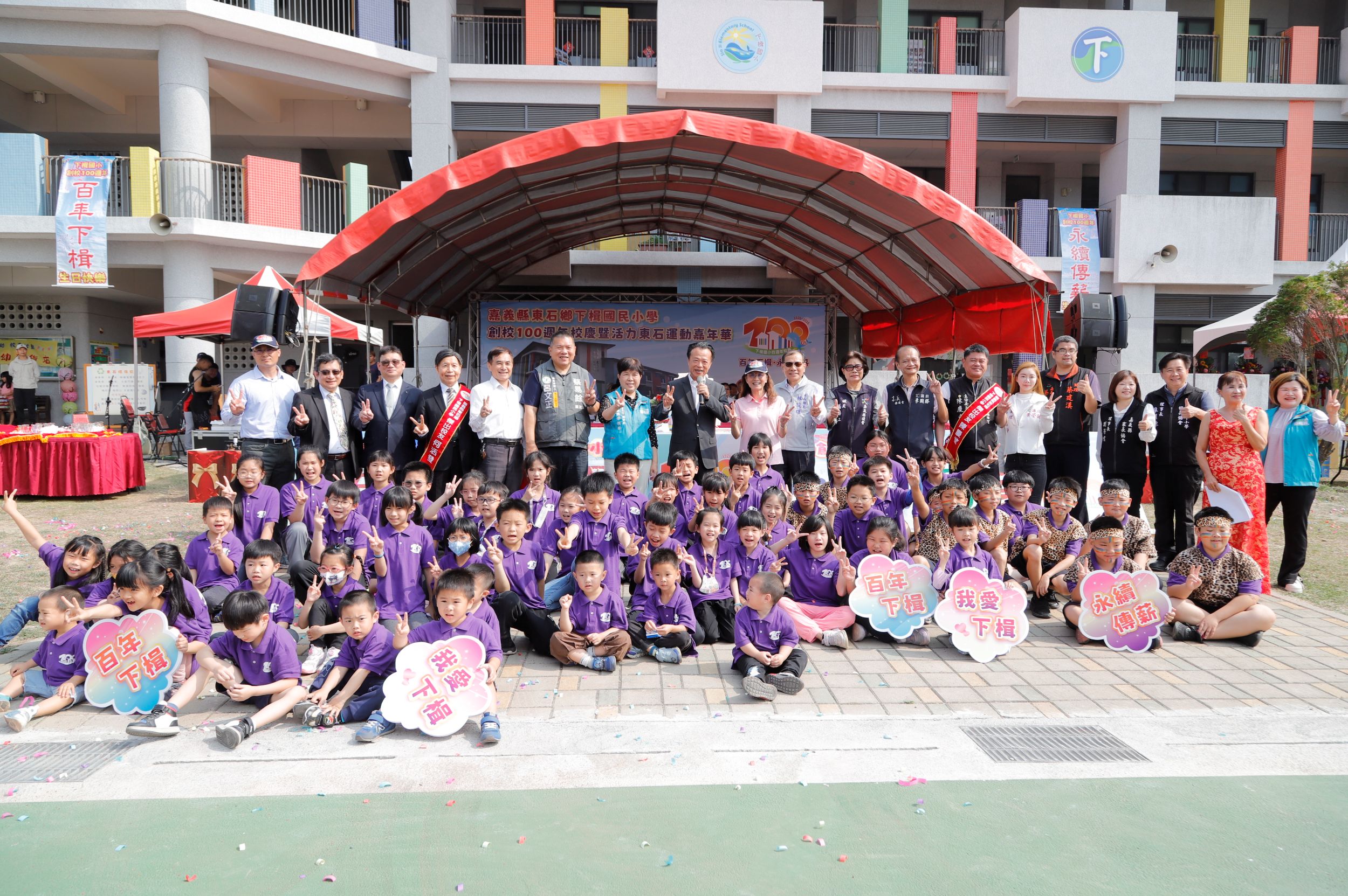 慶祝嘉義縣東石鄉下楫國小創校一百週年,縣長翁章梁於29日親臨現場,與歷屆校友、在地鄉親及各界貴賓齊聚一堂,共同切蛋糕、唱生日快樂歌,見證百年學府的重要里程碑。活動並結合趣味競賽、社區參與、市集展覽等多元內容,促進社區情感交流。