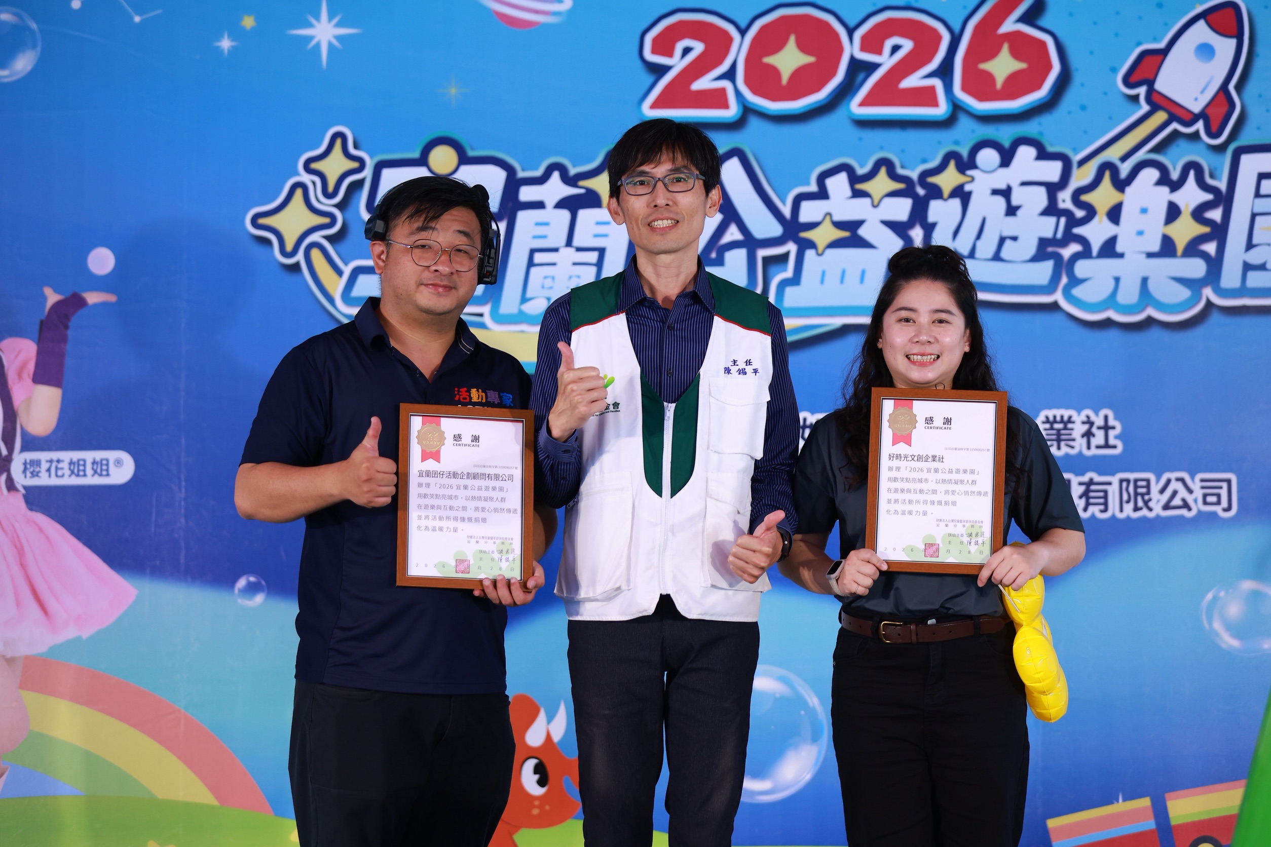 ▲宜蘭家扶中心主任陳錫平(中)致贈感謝狀,感謝主辦單位推動公益活動。(圖/宜蘭囝仔活動企劃顧問有限公司提供)