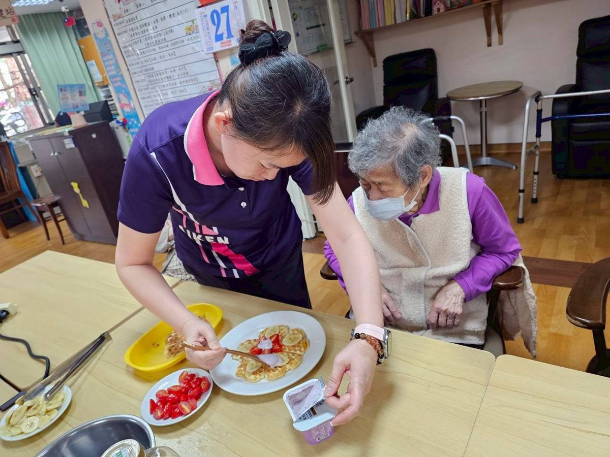 日照中心主任葉儒旻表示,為了確保活動順利進行,工作人員在事前做了萬全的準備。除了嚴選高品質的鬆餅粉、新鮮雞蛋與醇香牛奶作為基底,更貼心準備了色彩鮮豔且營養價值極高的配料,包括酸甜多汁的玉女番茄、口感綿密的香蕉,以及富含花青素的藍莓優格。所有食材均經過洗淨與切片處理,以確保長輩在操作時既安全又便利,能將專注力完全投入在創作的樂趣中。