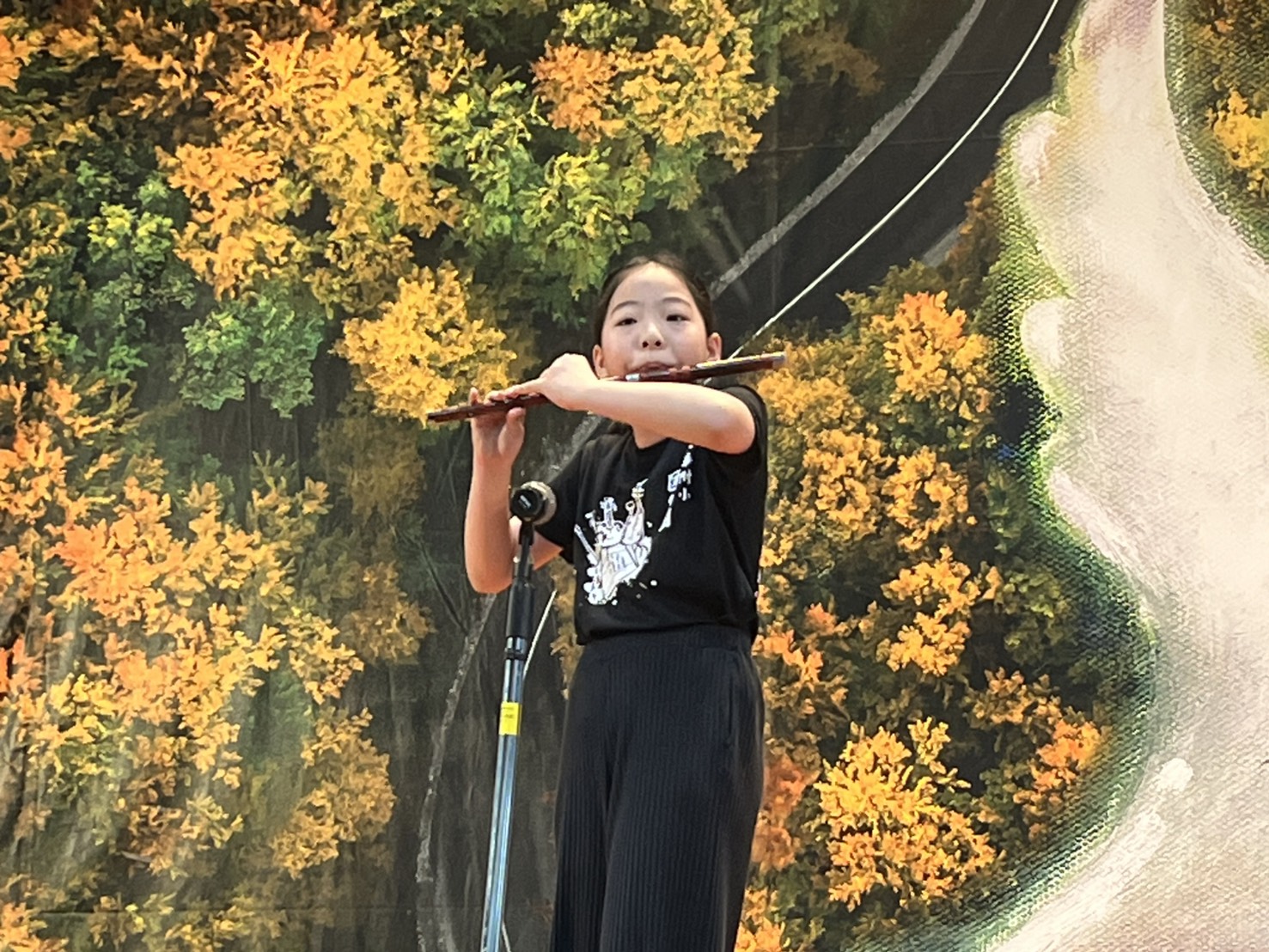 ▲三愛學生陳玥幃吹起笛子《打穀機的笑聲》,音色清亮,富有畫面感。