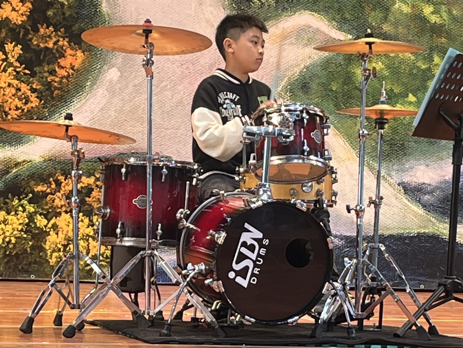 ▲四年愛班學生王麒諺打起爵士鼓《Your Idol》,節奏明快,渲染力強。