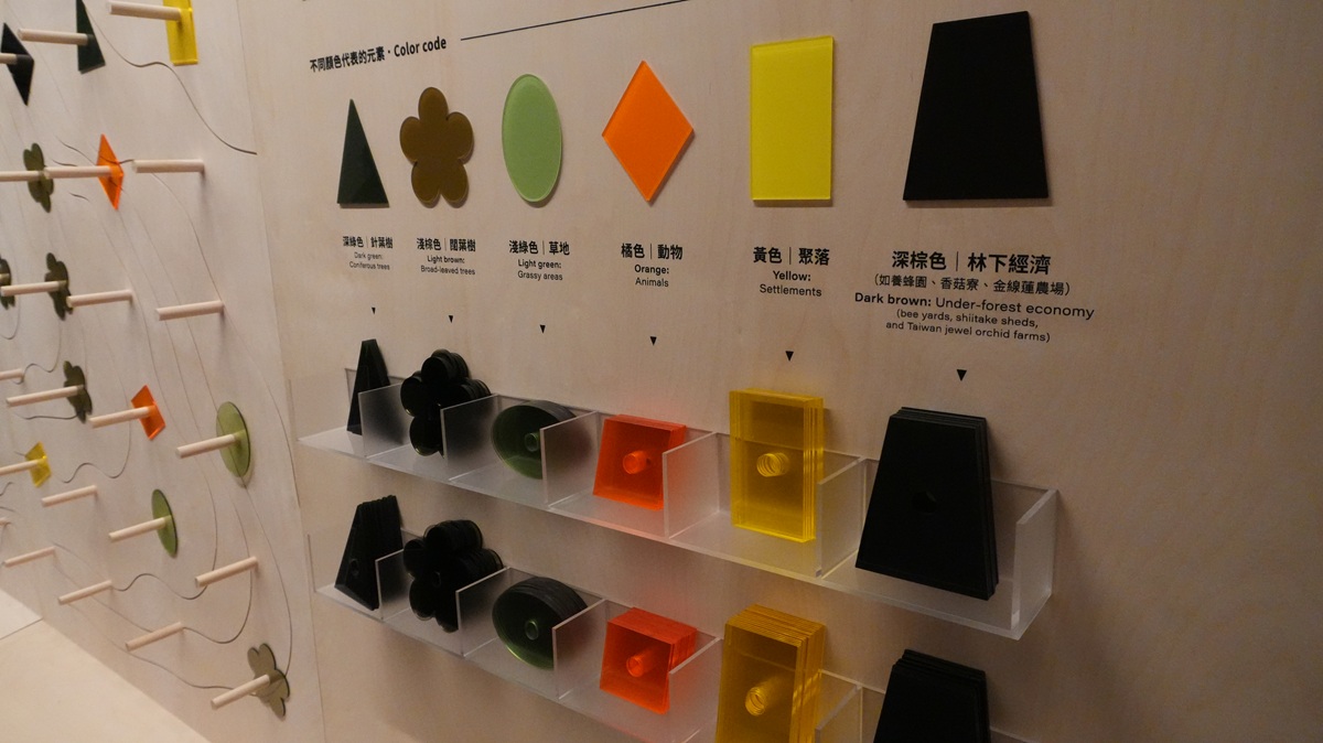 展區特別設置套圈圈互動區「共同想像的未來森林」,觀眾可將象徵不同元素的壓克力片放置於等高線牆面,深綠色是針葉樹、淺棕色是闊葉樹、橘色代表動物、黃色是聚落、深棕色是與森林共存的人為活動。林業及自然保育署邀請觀眾一起來想像未來森林的理想樣貌。