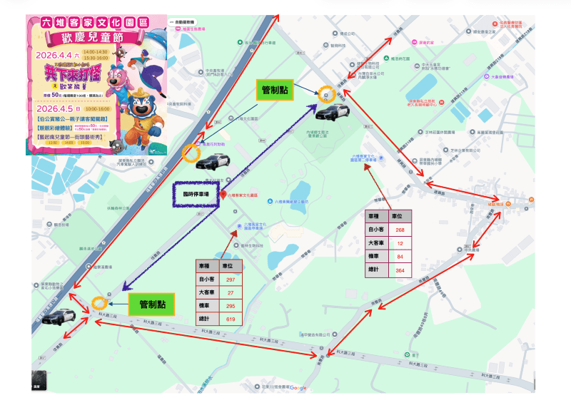 內埔警分局預估連假期間,遊客車輛會集中在早上9點到中午12點,進入園區內停車場。而車潮離去時間,大多集中在下午4點到6點。六堆客家文化園區內有2處停車場,第1停車場由園區大門口信義路進入,可停放自小客車297輛、大客車27輛、機車295輛。另第2停車場則位於,面對園區大門口左側的建興路上,可停放自小客車268輛、大客車12輛、機車84台。第1停車場滿位後,才會開放第2停車場。請各位駕駛朋友聽從園區工作人員交通指揮,無論您停在哪一個停車場,都能直接進入園區內遊玩。