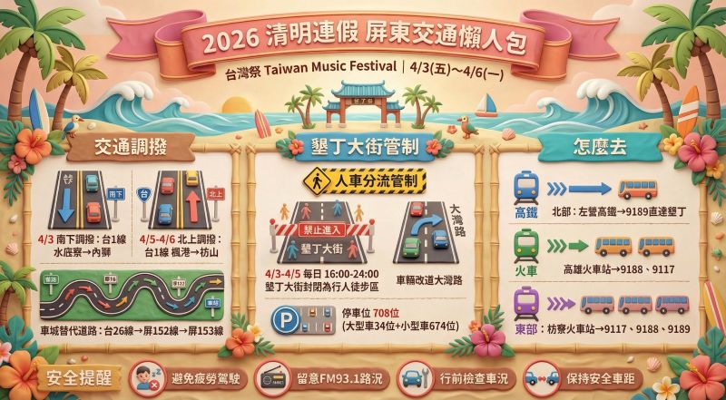 另為降低觀光區人車衝突風險,恆春分局將於4月3日至5日每日16時至24時,於墾丁大街實施人車分流管制,規劃行人徒步區,車輛請依引導改道大灣路行駛,以確保人車安全及活動品質。
