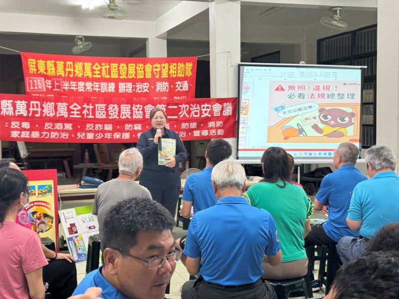 屏東警分局萬丹分駐所於3月30日晚間在萬丹鄉萬全社區辦理115年度首場社區治安會議,在地意見領袖屏東縣縣議員許展維、萬丹鄉民代表會副主席洪維呈等均親自蒞臨,與在地鄉親面對面交流生活安全議題。會中除了持續深耕「反詐騙、交通安全及婦幼安全」三大核心宣導外,更首度導入俗稱小橘書的「臺灣全民安全指引」手冊內容,期盼透過日常觀念的建立,讓民眾在面對突發狀況時能更加冷靜應變。