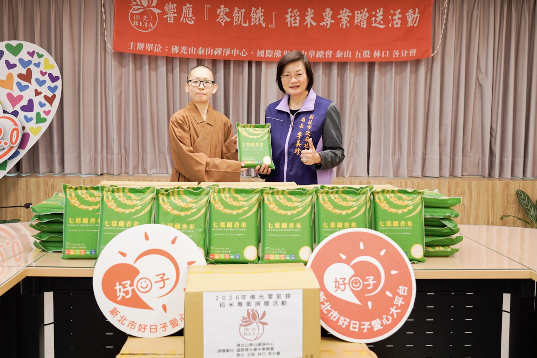 佛光山泰山禪淨中心響應新北市好日子愛心大平台,於1日捐贈1,866公斤白米,由新北市社會局長李美珍代表受贈,並回贈市長侯友宜感謝牌,這批滿載善念與祝福的愛心白米,後續將透過各社福中心發送予弱勢家庭,為家戶餐桌增添一份溫飽與安心。