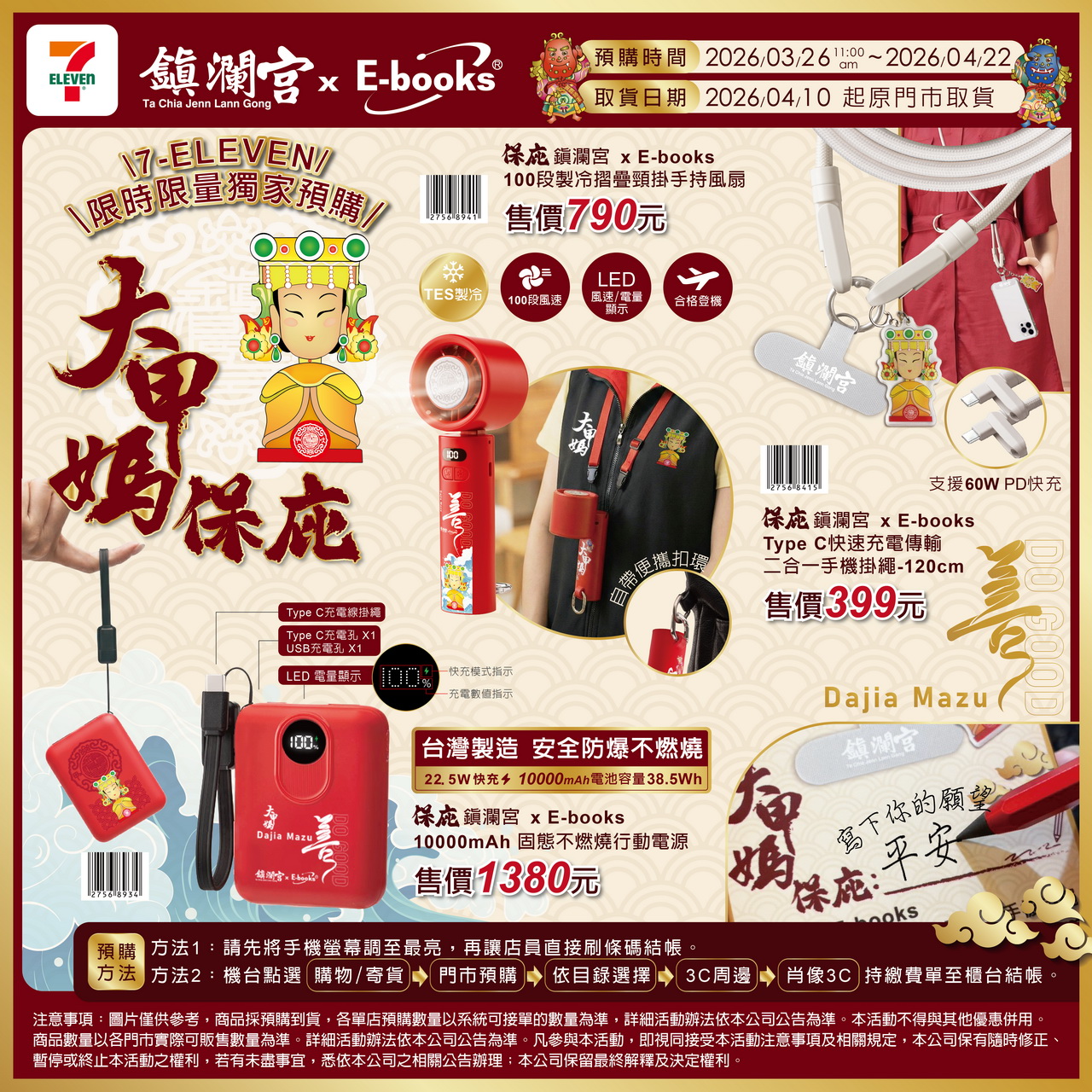 「【鎮瀾宮 × E-books】媽祖遶境科技補給站」系列於 3 月 26 日至 4 月 22 日 開放全台 7-ELEVEN 門市預購。為確保信徒能於 大甲媽2026 遶境前準備齊全,預購商品將自 4 月 10 日起開放取貨。中景科技建議廣大支持 台中大甲媽的信眾提早預訂,確保在起駕前備妥裝備,安心啟程。