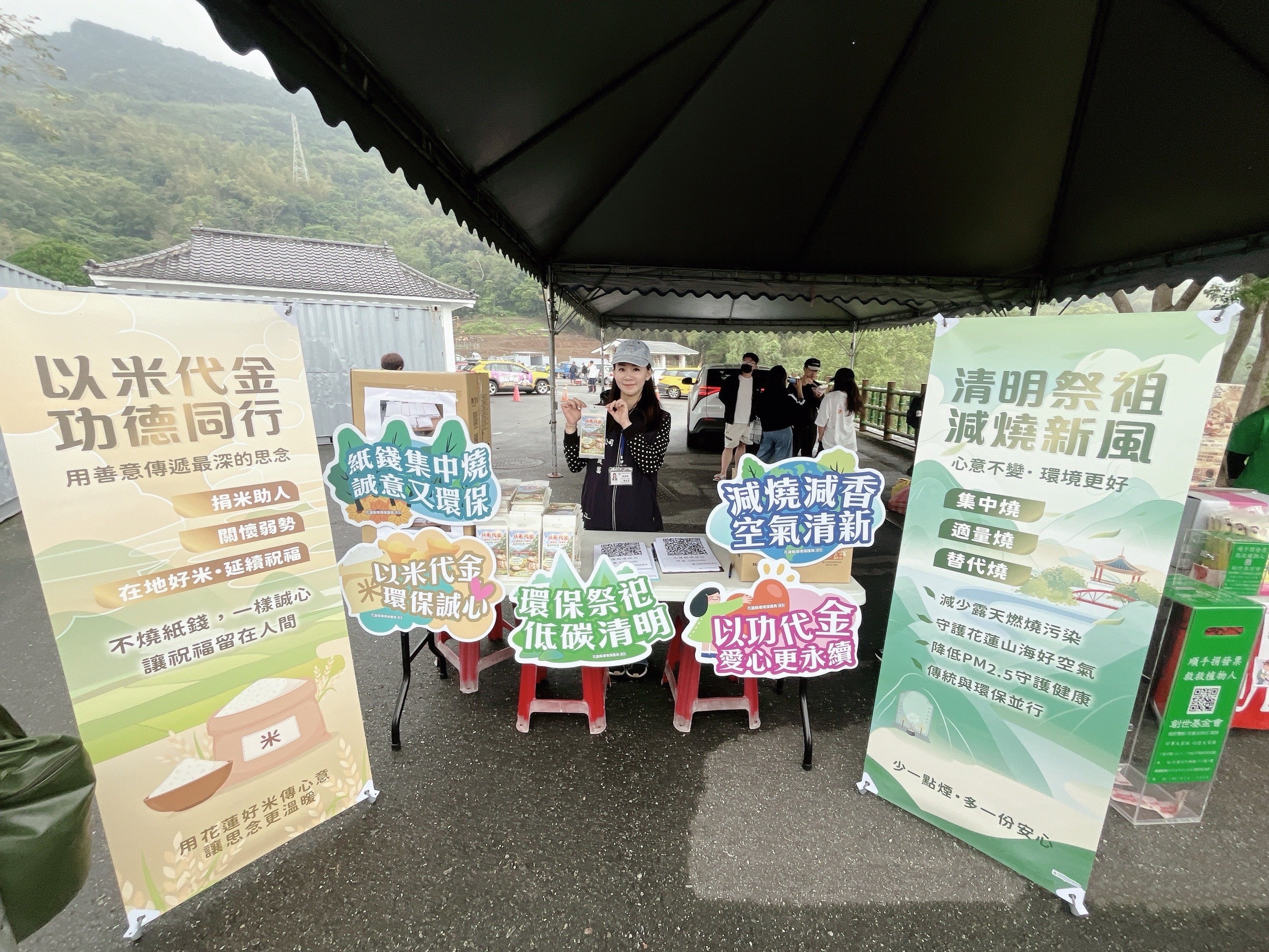 清明祭祀現代化,花蓮縣環境保護局除清明節前在勝安宮舉辦「紙錢收運專車」淨車儀式外,並在吉安鄉慈雲山懷恩園區辦理清明祭祖法會,設攤宣導「新紙錢三燒」與祭祀環保作為,籲請鄉親在慎終追遠之際,也留意用火,共同守護良好空氣品質。
