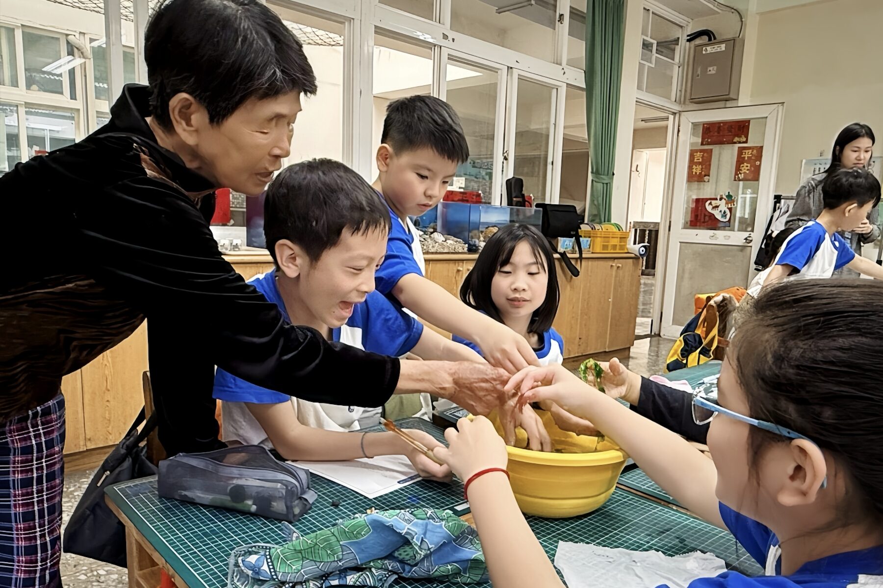 走入校園的課程充滿歡笑與感動,高齡的馬崗漁村資深海女陳罔市阿嬤親切地展示她平時下海採集石花、紫菜的專屬裝備,並逐一介紹「副仔」、「黜仔」等傳統採集工具。當阿嬤用充滿歷練的嗓音,分享她一生在海浪間「隨人顧性命」的採集點滴時,孩子們皆全神貫注地聆聽,真實感受到職人與大海搏鬥的堅韌生命力。除了動人的職人故事,現場也安排了「小小神農嚐百藻」的互動體驗,讓學童們觸摸水盆內的海藻。活動尾聲,學童們品嚐著沁涼甜美的石花凍,不僅豐富了味蕾,更將這份世代傳承的海洋情懷深刻留在心中。