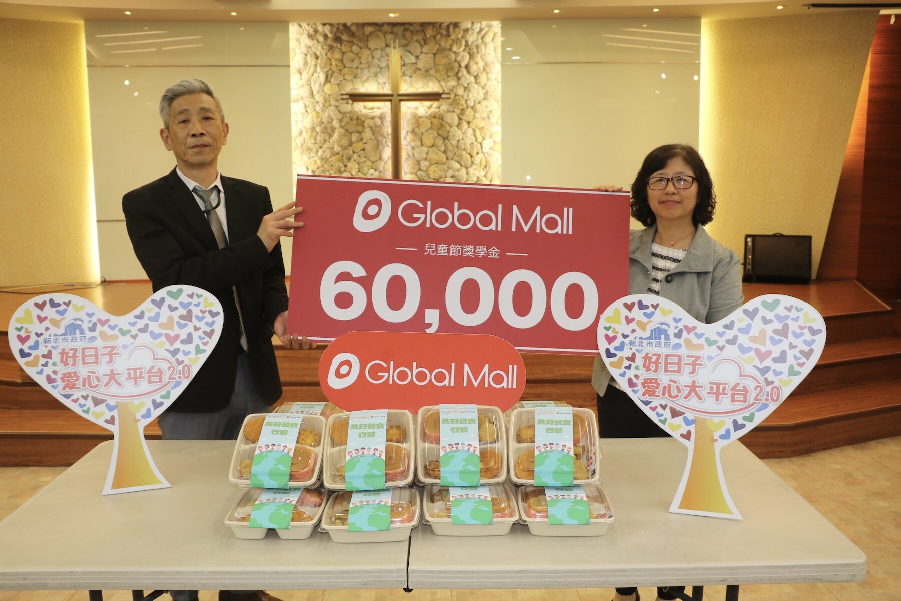 兒童節前夕,環球購物中心公司響應新北市好日子愛心大平台,於1日晚間在小衛星據點海山教會捐贈300份兒童餐盒及6萬元商品券,給板橋區11個據點的兒少,每份餐盒有炸雞塊、洪瑞珍三明治、蛋塔、飲料等,每人還有200元購物券,可以到環球自由選購。小衛星兒少在捐贈後,迫不及待打開餐盒,「嗯,好好吃!」據點裡充滿兒少的歡樂聲。