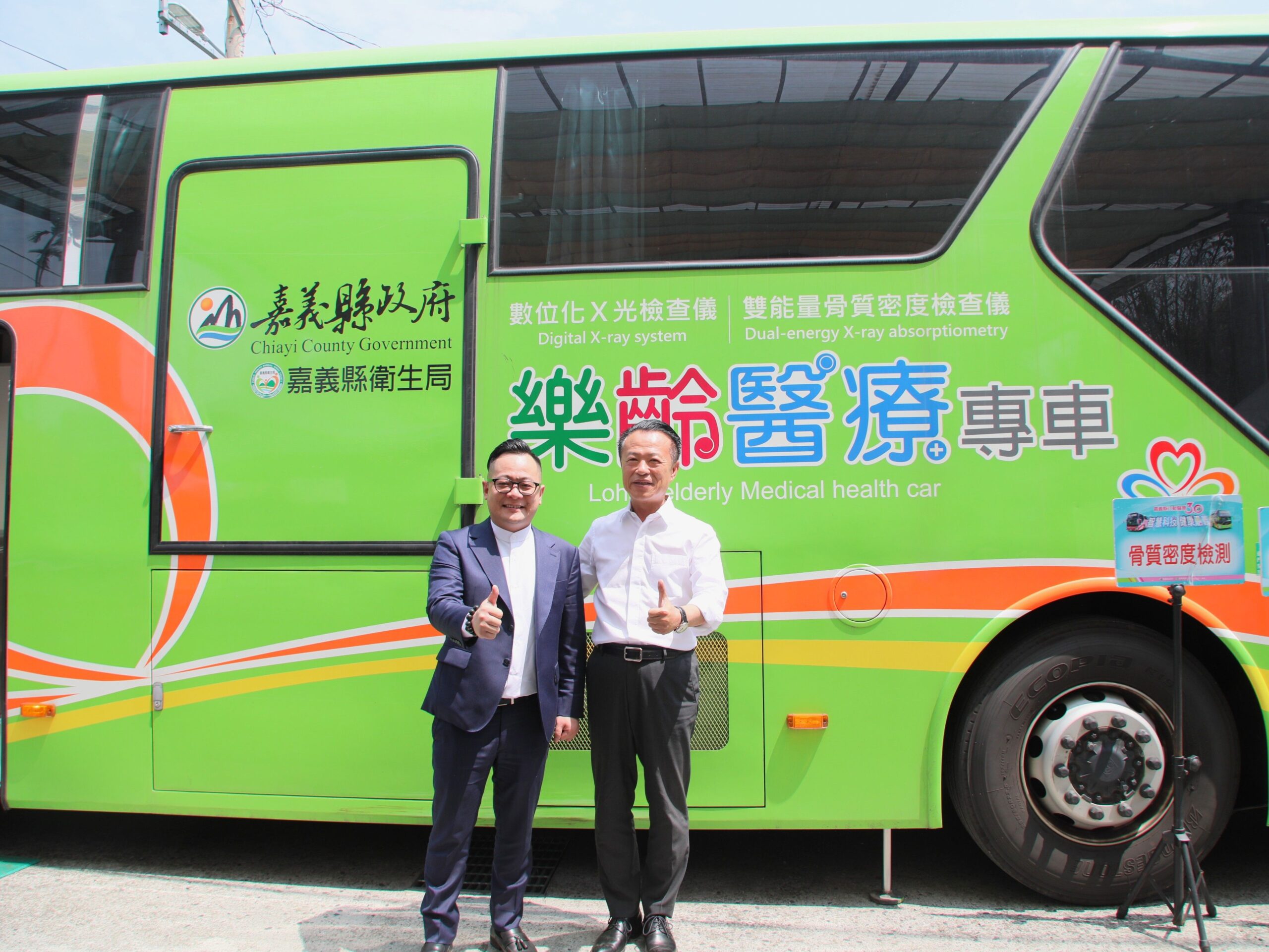 ▲基隆市議會議長童子瑋在嘉義縣長翁章梁陪同下,了解行動醫療車的服務情形。(圖/嘉義縣政府提供)