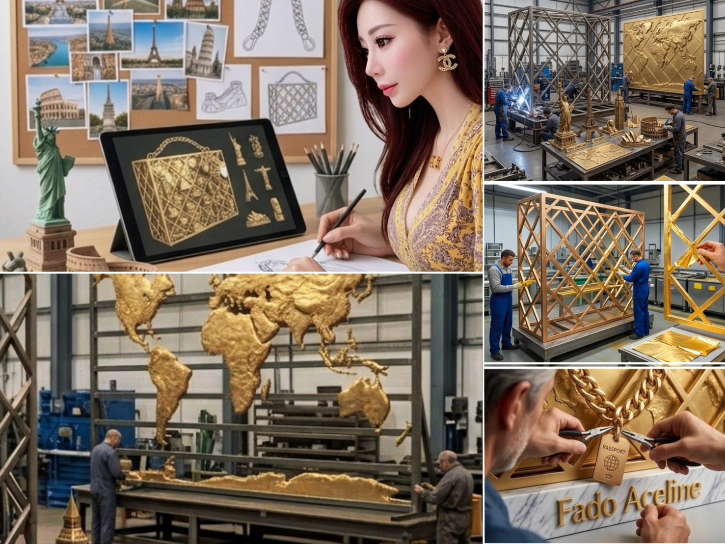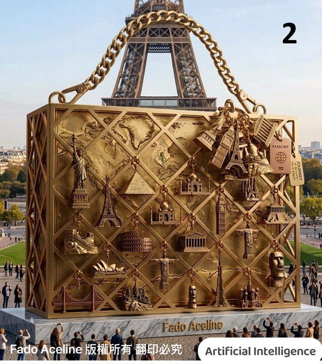 這件高 5公尺、寬 3公尺的宏偉裝置,以一只極具時尚象徵的金屬包為型,打破了日常物件與公共藝術的界限。作品透過精密的金屬格柵結構,編織出一幅輝煌的經緯地圖。格柵上磁吸著世界各地的經典地標——從巴黎艾菲爾鐵塔到埃及金字塔,從羅馬競技場到泰姬瑪哈陵這些「文化磁鐵」不僅是裝飾,更是人類集體記憶的縮影。