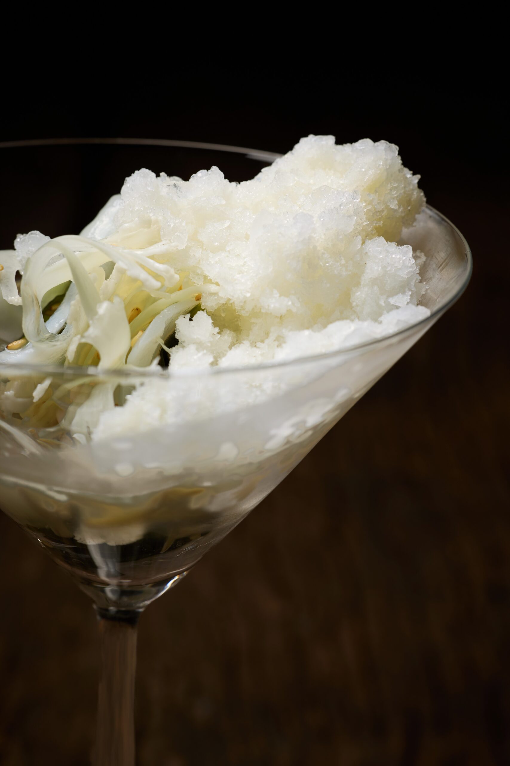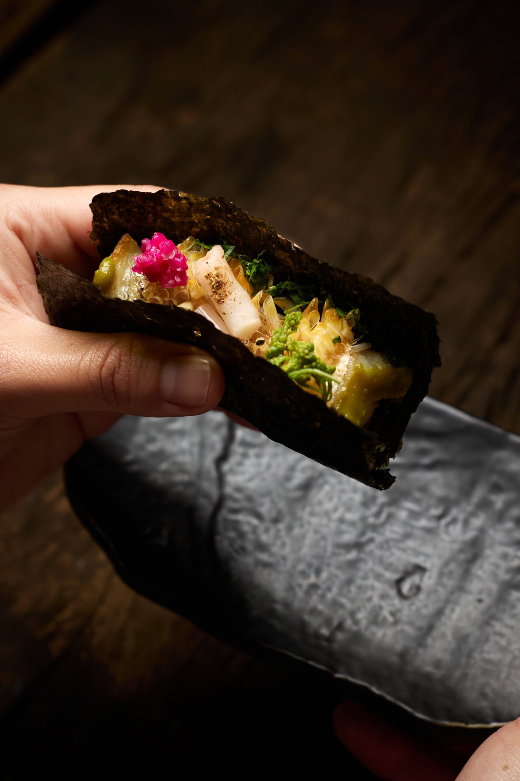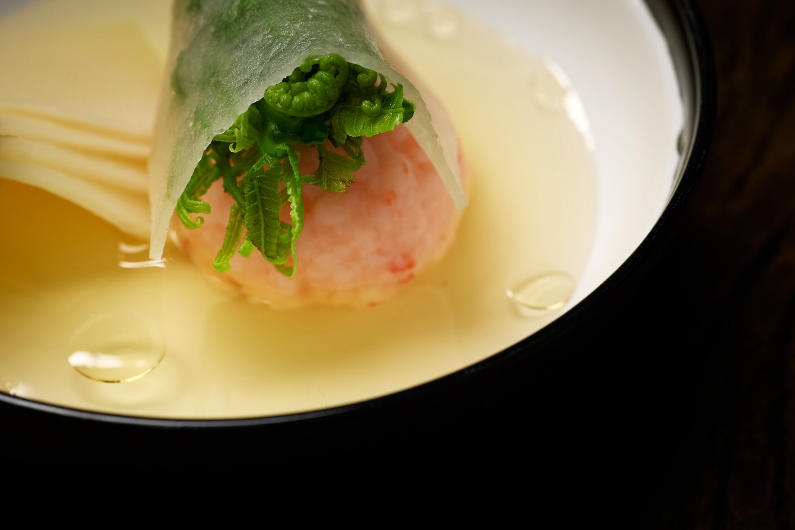 本季菜單從山頂融雪開始。雪水沿著山勢流動,滋養山林,嫩芽長出、花苞形成,延伸至海,最後一路回到繁花盛開的花園。十道料理依此鋪陳,構成一段從山到海的春日路徑。純白絕美的〈化雪初露〉以牛奶與魚高湯呈現雪融的柔和質地,搭配軟絲、白花椰菜與蓴菜,帶出充滿想像的開場。〈香雪海老毬〉與〈春芽立鱗燒〉結合山林野菜與海味,從貓蕨、春筍到花山椒與馬頭魚,呈現春天初醒的氣息;〈魚冊〉以費工拍打成透明薄片的生魚片,鋪展成花瓣盛開的樣子,搭配秘魯醬汁,帶有柑橘調性的酸度,帶來熟悉又異國情調的口感與風味。