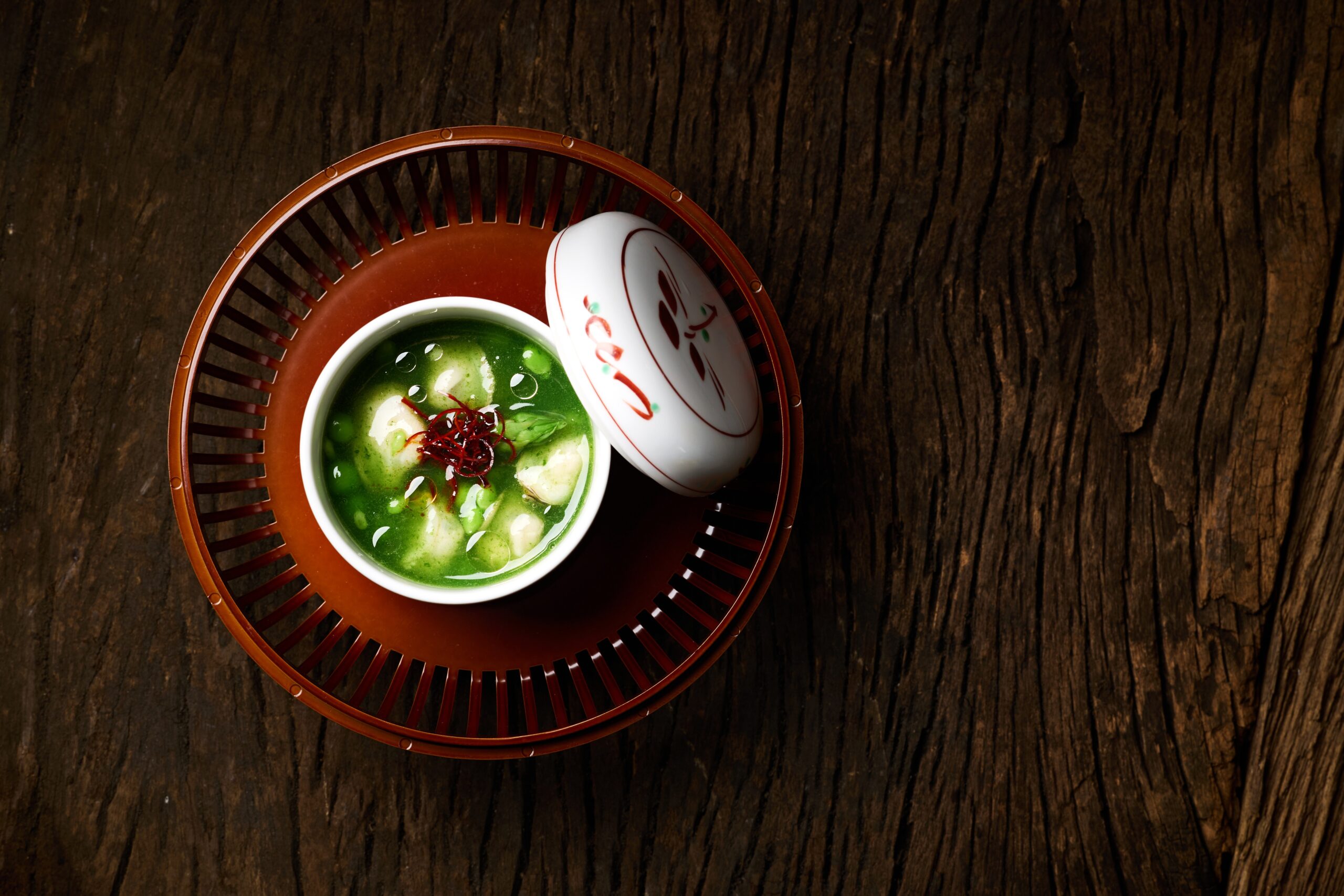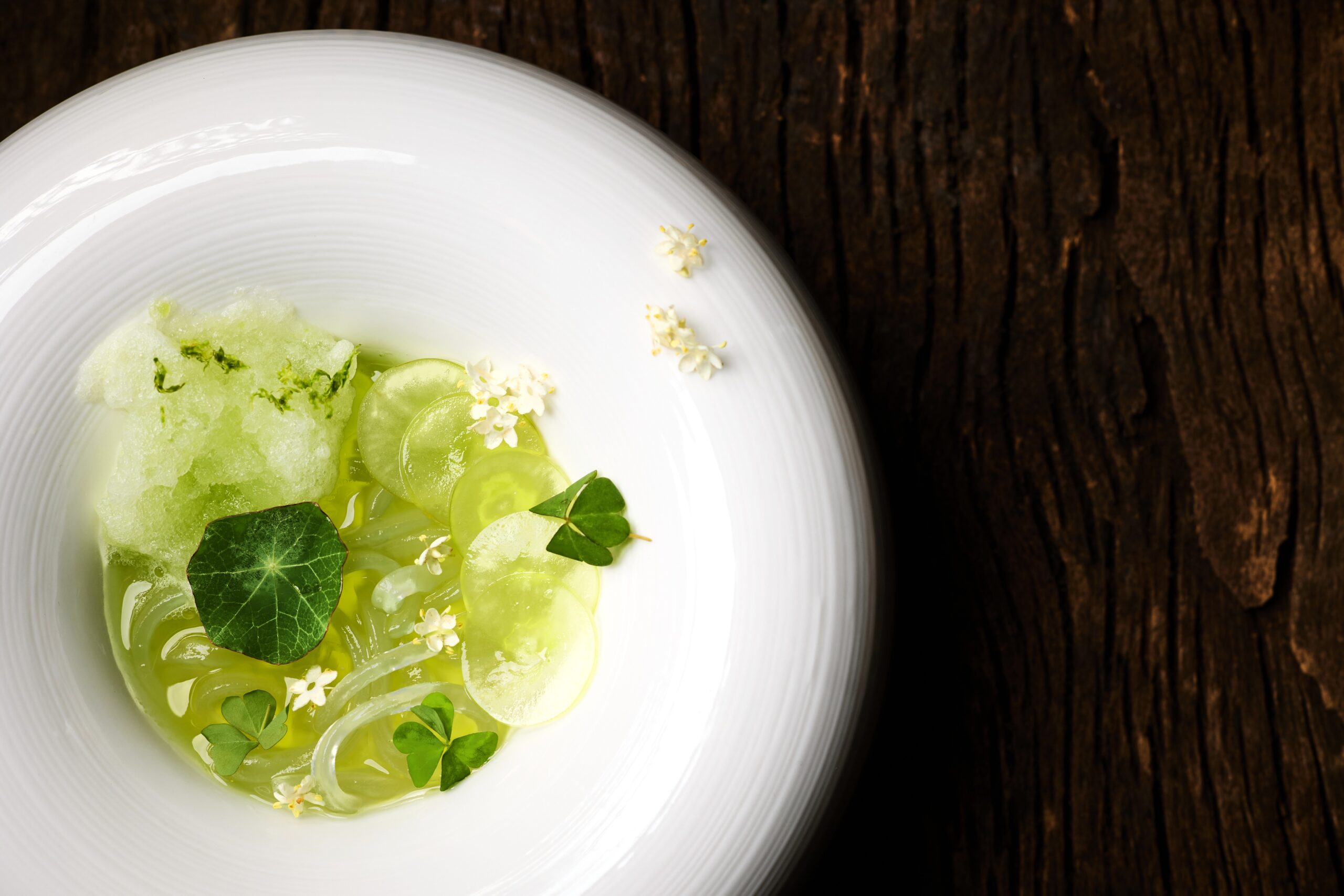 甜點〈碧玉葛切〉,以葛切的滑順口感結合石蓮花的清酸與接骨木花的香氣,留下清爽餘韻,也帶來各種春天綠意盎然的意象。本季亦以「花」作為重要元素。從野薑花、花山椒、櫻花、桂花、洛神花,到櫛瓜花、接骨木花與小菊花,搭配白花椰菜、金針花與青花筍等食材。不同花材在料理中各有表現,有的帶出淡雅香氣,有的提供輕微苦韻,也有的轉化為柔和酸度,讓每一道料理在入口後能逐步展開春天的畫面和層層風味。《春絮》一個季節,五個國家,六杯茶酒,十道料理。一段從山林到海洋的春日體驗價格NT$ 3,680+10%/人,十道旬味料理。
