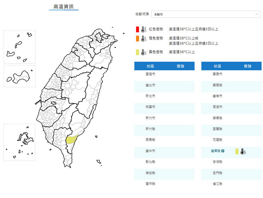 另因西南風沉降影響,臺東縣有焚風發生的機率,今日白天為黃色燈號,請注意防曬、多補充水份、慎防熱傷害。