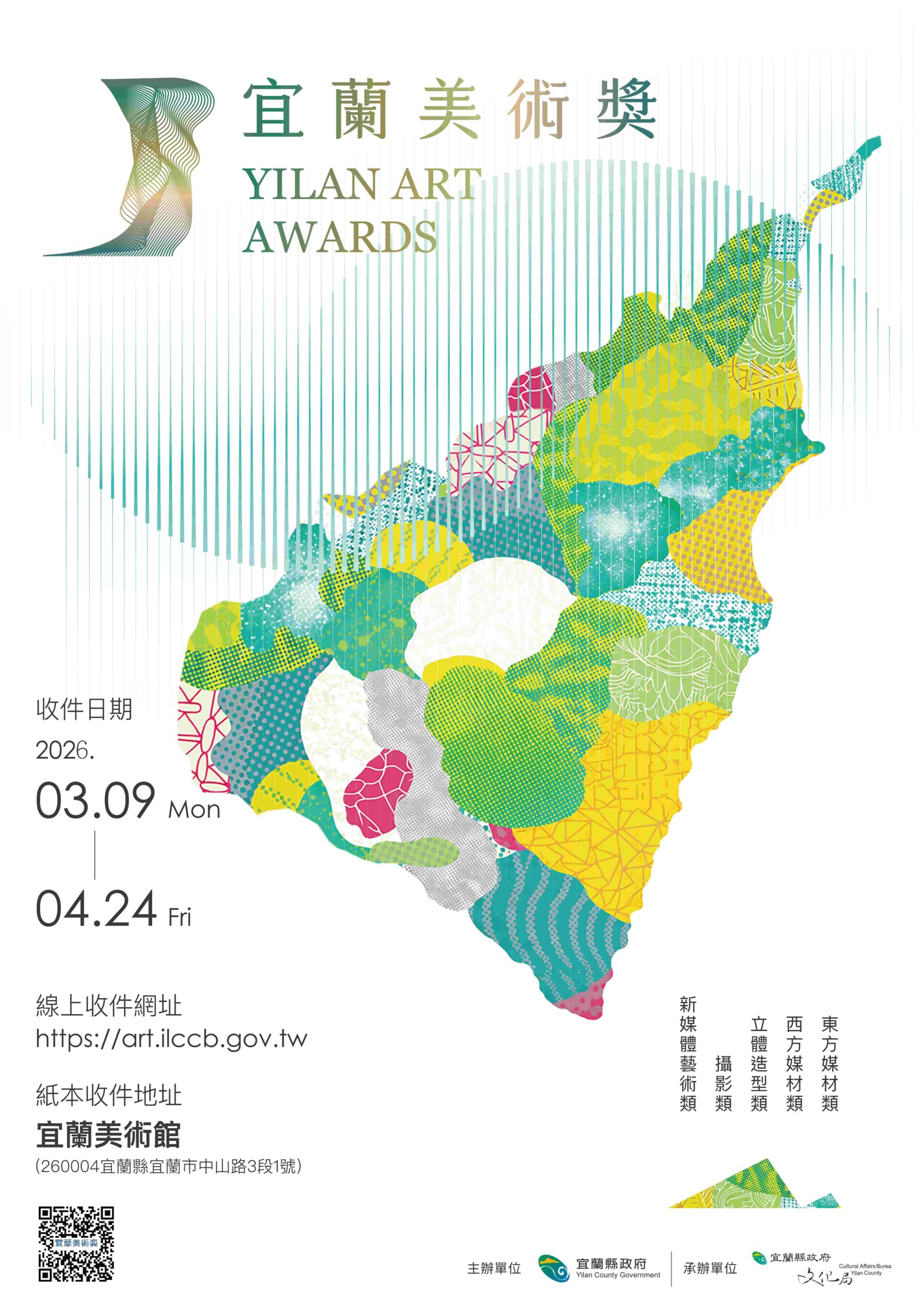 「2026宜蘭美術獎」徵件最後倒數,收件至115年4月24日止,徵件規劃東方媒材類、西方媒材類、立體造型類、攝影類及新媒體藝術類五大類別。獎項方面,最高榮譽「宜蘭獎」1名,獎金新臺幣20萬元,作品由文化局典藏,並可於次年起3年內於宜蘭縣政府文化局展場舉辦個展;另設銀獎7萬元(2名)、銅獎5萬元(2名)、優選每名1萬5,000元(12名)及佳作若干名。此外,特別設置「宜蘭意象獎」,鼓勵創作者將宜蘭在地文化、風景與人文融入作品,讓創作成果更具在地連結,得獎者可另獲獎金10萬元,並獲文化局典藏作品。