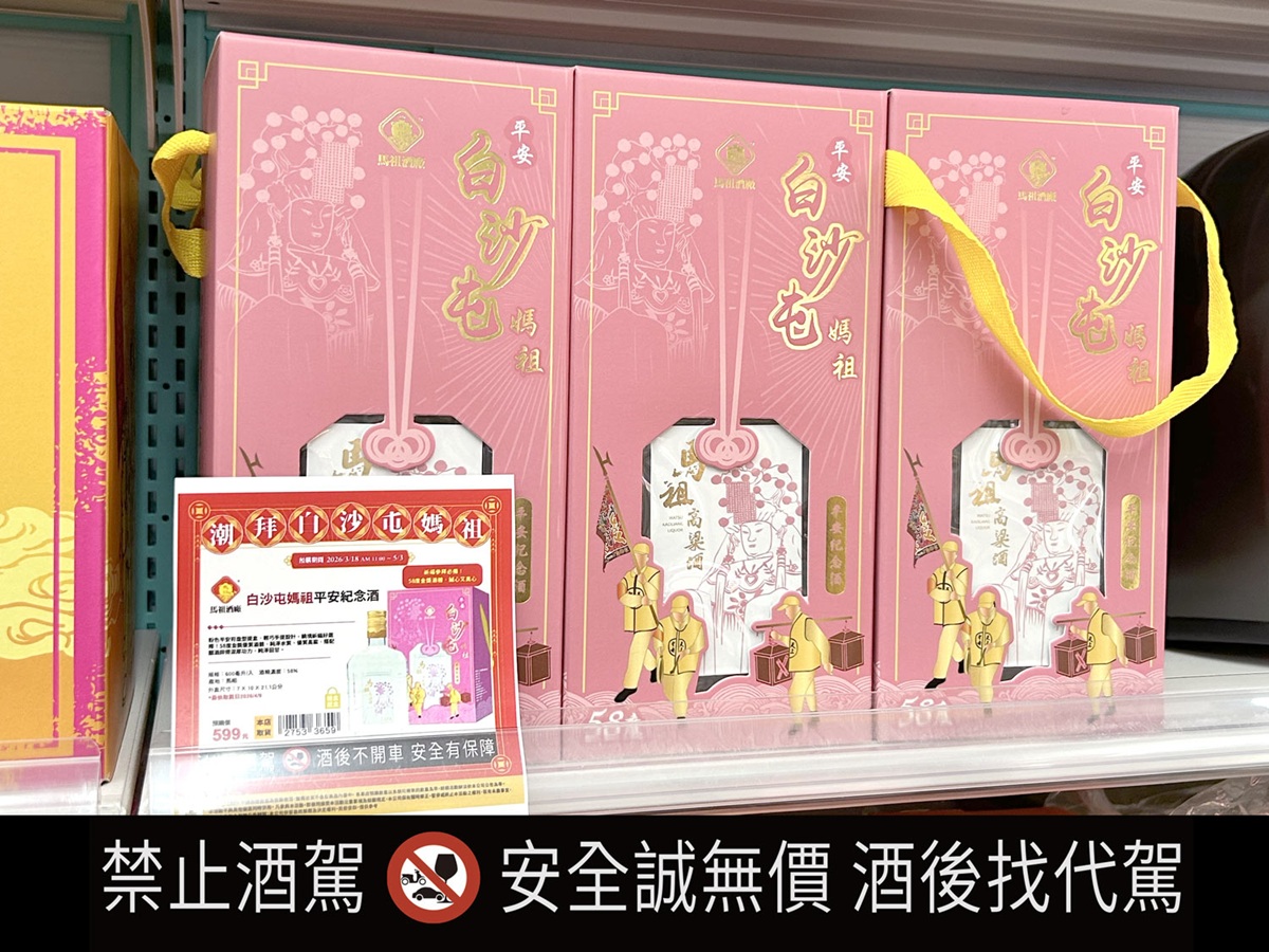 「白沙屯媽祖平安紀念酒」特選58度雙金獎酒體,為馬祖高梁中最具指標性酒體之一,以得天獨厚的釀酒環境與跨越半世紀的釀酒工藝,深受老饕們的喜愛,更連續榮獲2024、2025舊金山世界烈酒大賽金獎、雙金獎榮譽。58度酒體帶有柑橘、穀糧香,酒體濃烈渾厚又有水梨清甜果香,尾韻飽滿而細長,展現出馬祖高梁酒特有的醇烈風味。600ml單瓶預購價 $599元,馬酒台北直營門市、7-11、全家、OK超商、萊爾富、家樂福、酒類專門店、郵局等即日起陸續販售。(實際售價及開賣日期依各通路為主),全台酒專專門店查詢:https://www.taisun.com.tw/brand/matsu-liquor/store/