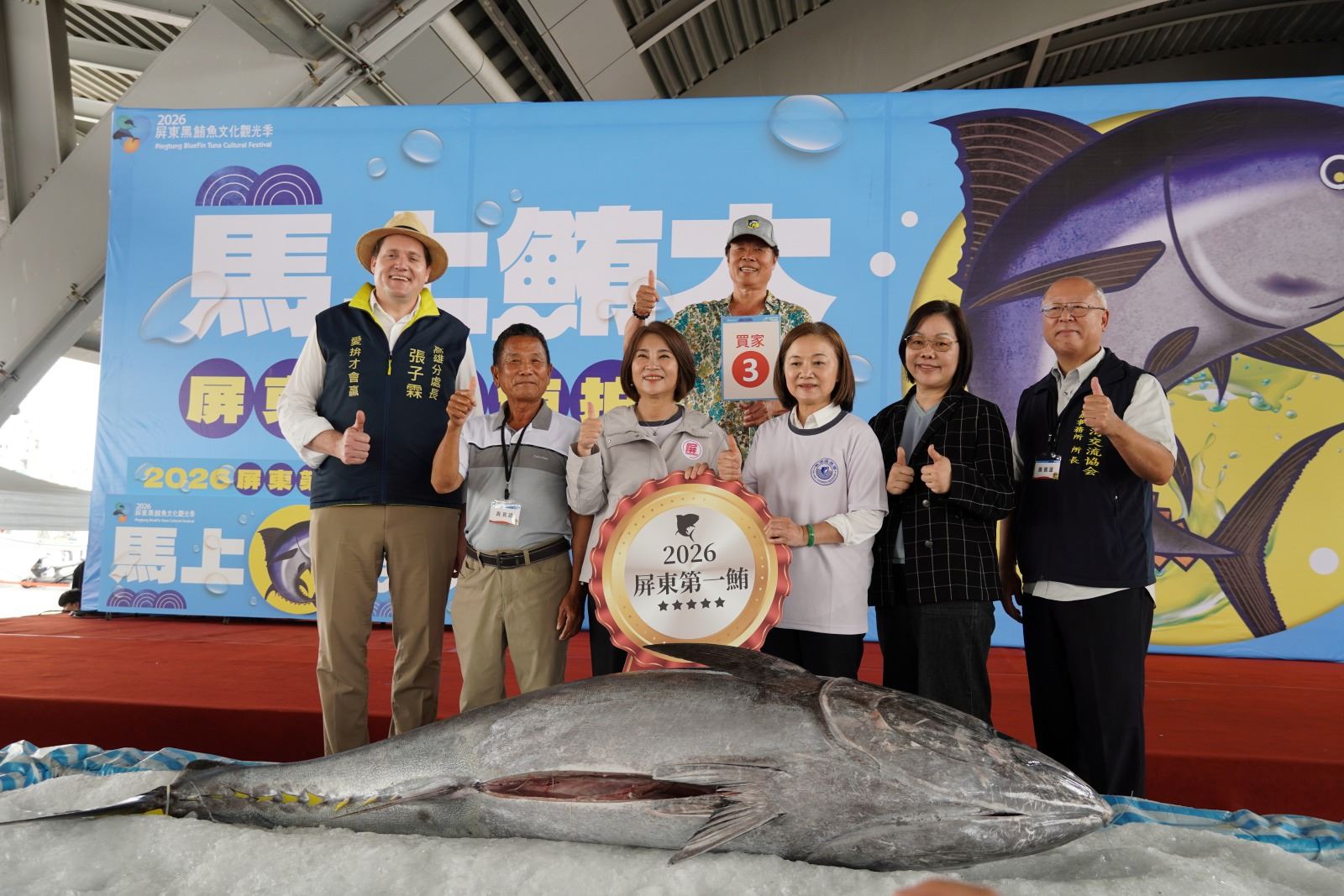 【記者范家豪/屏東報導】 屏東黑鮪魚季邁入第26年,琉球籍漁船「富漁慶2號」不僅捕獲屏東第一鮪,更是台灣第一鮪,今(8)日在東港魚市場舉行拍賣會,由縣長周春米擔任拍賣官,最後由佳珍海產餐廳與澎坊股份有限公司共同競標成功,以每公斤1萬600元得標、總價201萬4,000元,每公斤價格破去年紀錄,現場響起掌聲與歡呼聲。