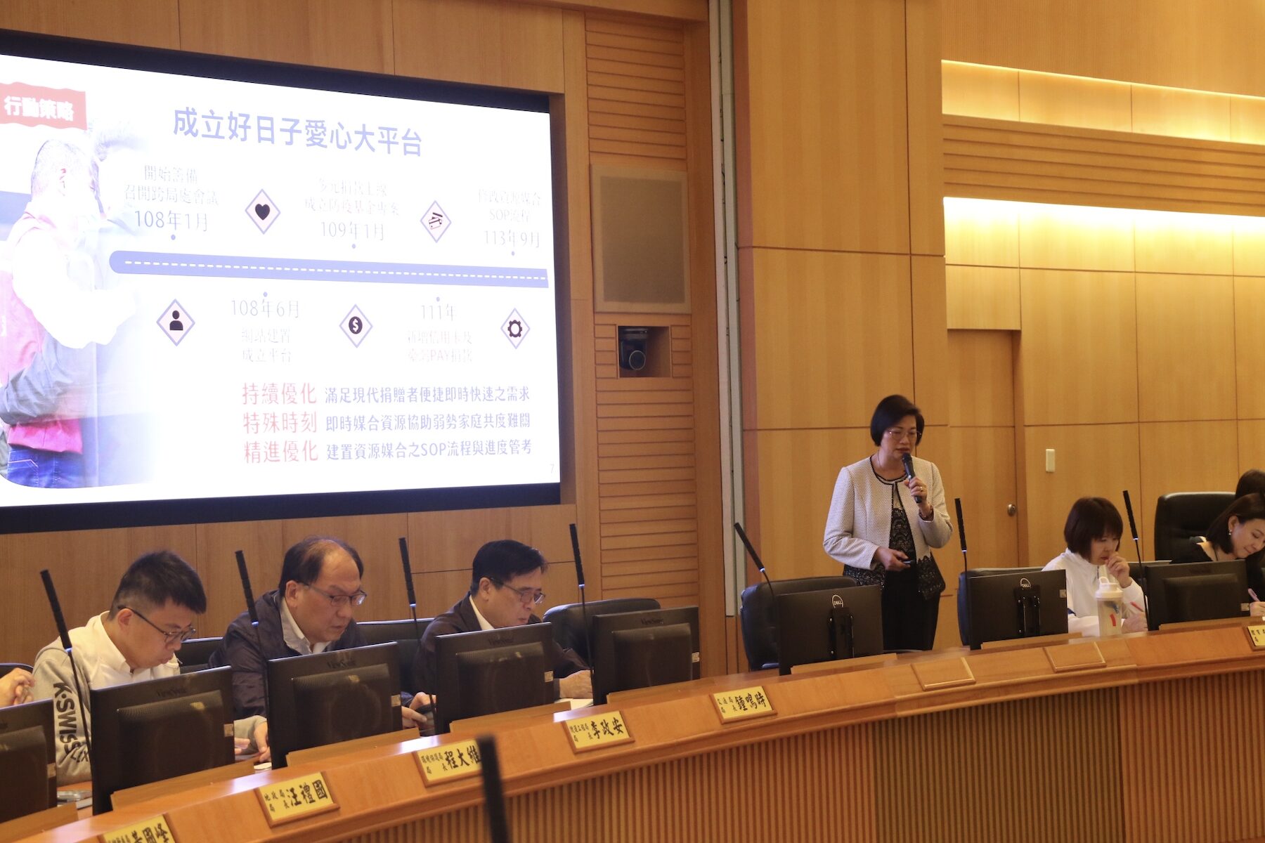 新北市社會局長李美珍8日在市政會議中,以「全國首創私公協力新模式、點亮新北好日子」為題,報告說市府推動好日子愛心大平台以來,媒合了市值物資和善款共55億元,幫助6千多萬人次,未來會再精進好日子愛心品牌、結合企業永續發展和社會責任ESG模組,並利用大數據,提出需求分析,以供捐贈者參考。侯友宜市長表示,新北市幅員遼闊,各類社會福利人口居全國之冠,但統籌分配稅款不足,且人均預算為6都最低,感謝每一位「圓夢英雄」藉由好日子愛心大平台,集結物資及善款挹注,「當有缺口時,就有光照射進來!」帶給弱勢族群許多溫暖和照顧。