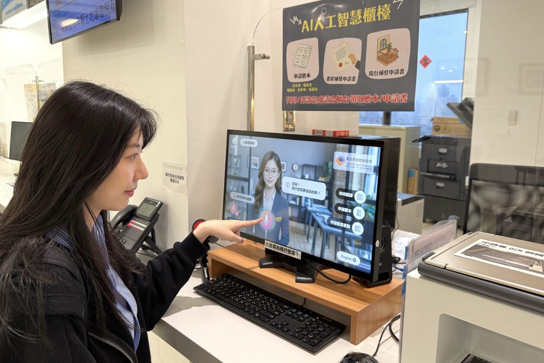 新北市地政局局長汪禮國表示,AI人工智慧櫃檯本次最大的亮點就是全國首創的「虛擬人像AI智慧客服」,導入生成式AI與語音互動技術,民眾只需以口語方式詢問各類地政問題,即可獲得如真人服務般的即時專業解說,大幅提升洽公效率,且考量多元族群的需求,還有中英雙向同步翻譯功能,無論本國民眾或外籍人士,都能輕鬆溝通、快速取得所需資訊。
