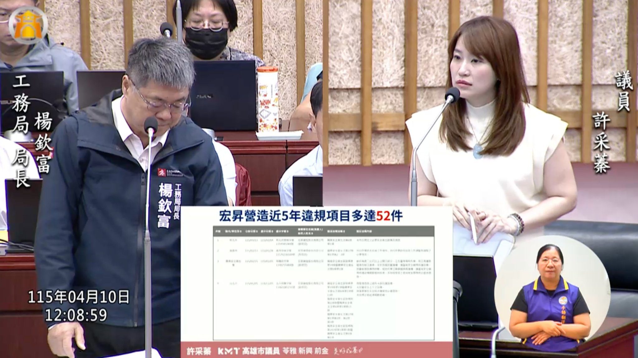 【記者吳奕/高雄報導】針對近期凹子底聯開案工地發生鋼筋墜落致死意外,造成一名 27 歲勞工不幸喪命,高雄市議員許采蓁今日於議會重砲轟擊工務局安全監督失能。許采蓁揭露承攬廠商宏昇營造是嚴重的工安累犯,質疑市府裁罰過輕、復工過快,要求市府比照台北、台中模式,對問題廠商實施全面停工清查,展現守護人命的決心 。