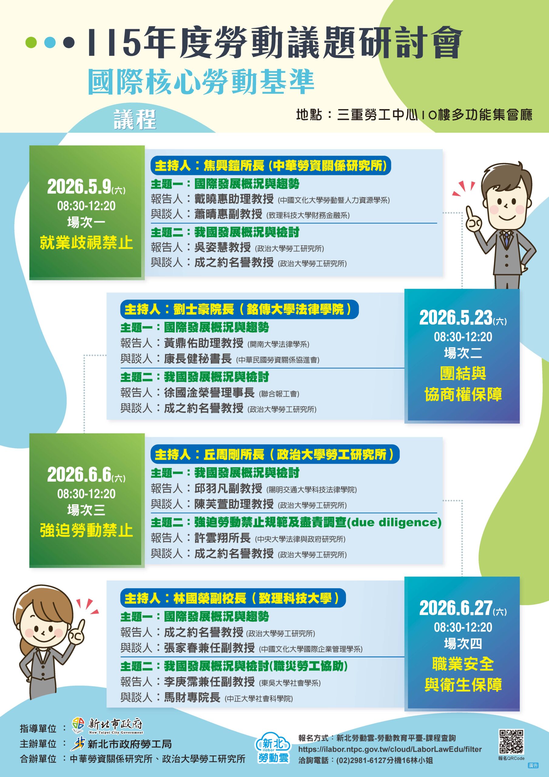 勞工局後續將於5月23日、6月6日及6月27日還將陸續舉辦三場研討會,分別探討「團結與協商權保障」、「強迫勞動禁止」及「職業安全與衛生保障」等重要議題。歡迎對勞動議題有興趣的學生、市民及勞工團體踴躍報名參加。報名請至「新北勞動雲-勞動教育平臺-課程查詢」(https://ilabor.ntpc.gov.tw/cloud/LaborLawEdu) 報名,若有疑問亦可電22983639洽詢。