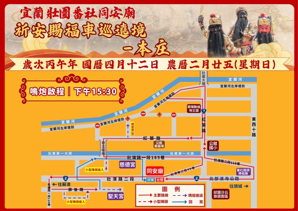 活動將於4月11日(農曆2月24日)展開,並於4月12日(農曆2月25日)上午8時進行壯圍鄉遶境,下午3時30分進入本庄地區,透過車巡方式將祝福帶入庄頭,與地方居民共享年度盛事。