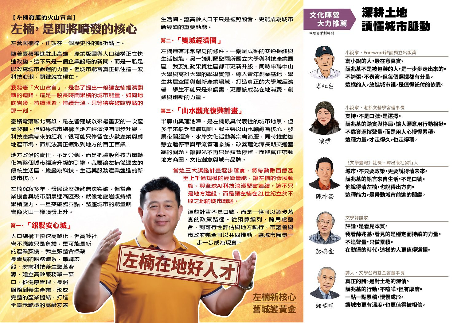 文宣中也提出左楠未來發展藍圖。面對台積電進駐所帶動的北高雄產業轉型契機,薛兆基認為左楠正站在重要轉折點,地方政治不應只是跟隨變化,更應提前布局,讓產業升級帶來的能量,真正轉化為地方經濟、生活品質與城市競爭力的全面提升。