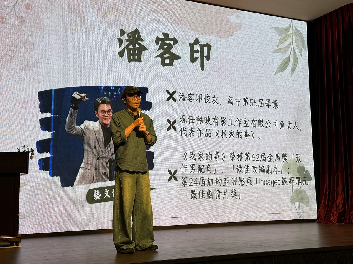 ▲傑出校友潘客印導演致詞時亦感性分享,直言「拍電影並不容易」,一路走來感謝母校與校友會這片土地所給予的養分與支持。(圖/員林高中提供)
