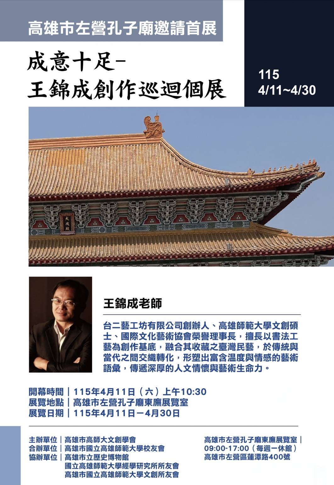 「成意十足-王錦成創作巡迴個展」不僅為高雄市左營孔子廟整修後的重要里程碑,也象徵文化資產活化與藝術創作結合的新契機。透過多媒材書法的創新表現,藝術家將個人情感與城市記憶轉化為可感的藝術語言,使歷史空間展現嶄新生命力。主辦單位期盼,未來能持續引入多元藝文展演,讓文化場域不僅保存歷史,更能成為當代生活的一部分,推動城市美學向下扎根,讓藝術真正走入日常、走入人心。