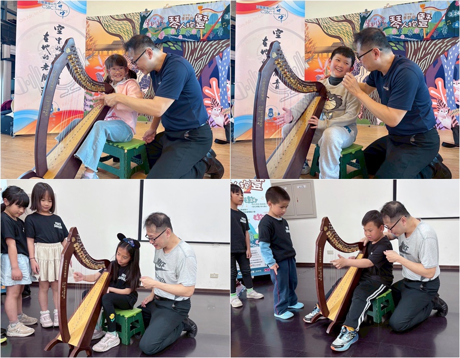 ▲李哲音老師指導小朋友體驗彈撥豎琴。(圖/正聲台中台)