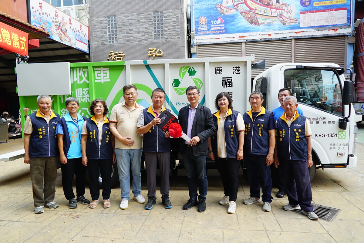鹿港福德祠管理委員會主委施炳坤表示,有鑑於鹿港清潔隊對於地方垃圾處理清運的辛勞,特地購贈一台「6.5噸升降尾門傾卸式資源回收車」,這台資源回收車,配備有液壓升降尾門與自動傾卸功能,不僅能大幅降低清潔人員搬運回收物的負擔,並縮短作業時間,讓資源回收流程可以有效提高更效能。