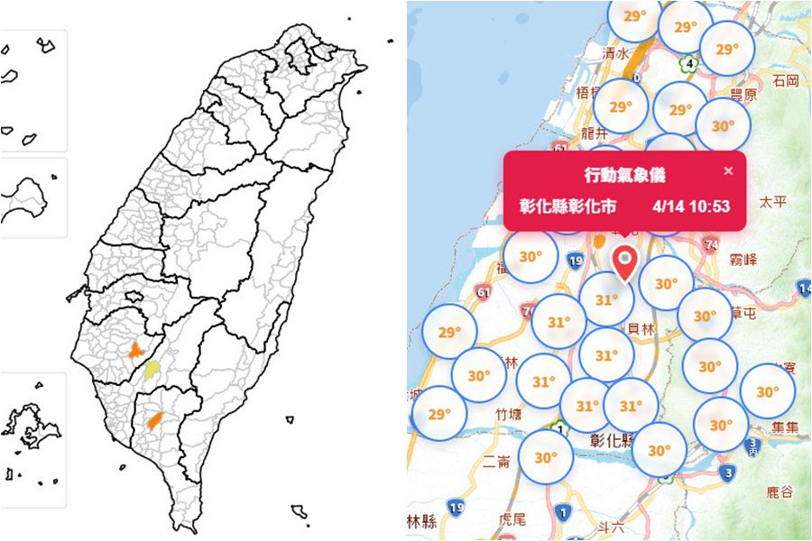 今天4月14日天氣晴朗炎熱,氣象署上午發出高溫資訊,白天臺南市、屏東縣為橙色燈號,有連續出現36度高溫的機率,高雄市為黃色燈號,也有36度以上的高溫。另據白沙屯媽祖行動氣象儀顯示,白沙屯媽祖及隨行進香隊伍上午10時至11時路經彰化縣市,約有30度炎熱氣溫。請注意防曬、多補充水份、慎防熱傷害。