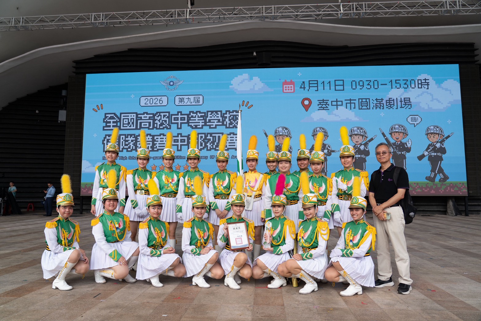校長詹滿福相當讚賞儀隊同學們的表現和努力,更感謝儀隊教練鄭尹貞、賴偉皓的辛勞付出。他表示,花女儀隊在課業與高強度操演的壓力下,長時間投入訓練,從基礎動作到整體默契反覆修正,當天比賽現場有眾多花女儀隊歷屆畢業的學姊到場加油打氣,不斷吶喊:「學妹不要怕,學姊在這裡!」對許多畢業學姊到場力挺,讓他為之動容。