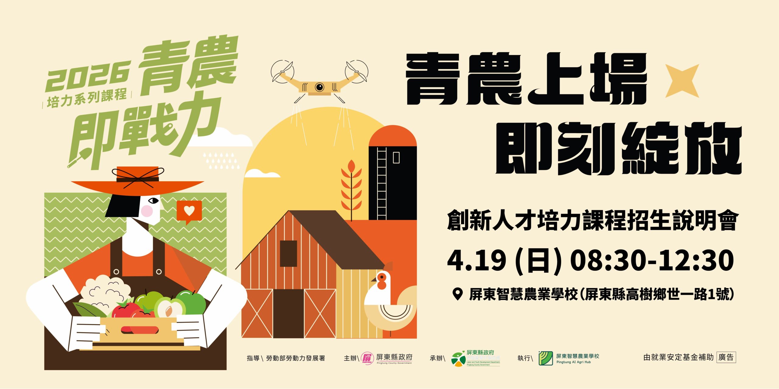 勞動暨青年發展處表示,「青農即戰力」不僅是一項職能培育計畫,更是一場翻轉農村價值、重塑「新農業、新青年」形象的重要行動。誠摯邀請對農業懷抱熱情與想法的青年,一同投入這場土地創新的行列,在屏東這片沃土上,書寫屬於新世代的農業新篇章。相關報名資訊請持續關注「屏東青航站(青年學院)」、「屏東智慧農業學校」Facebook專頁,或電洽(08)795-7228。