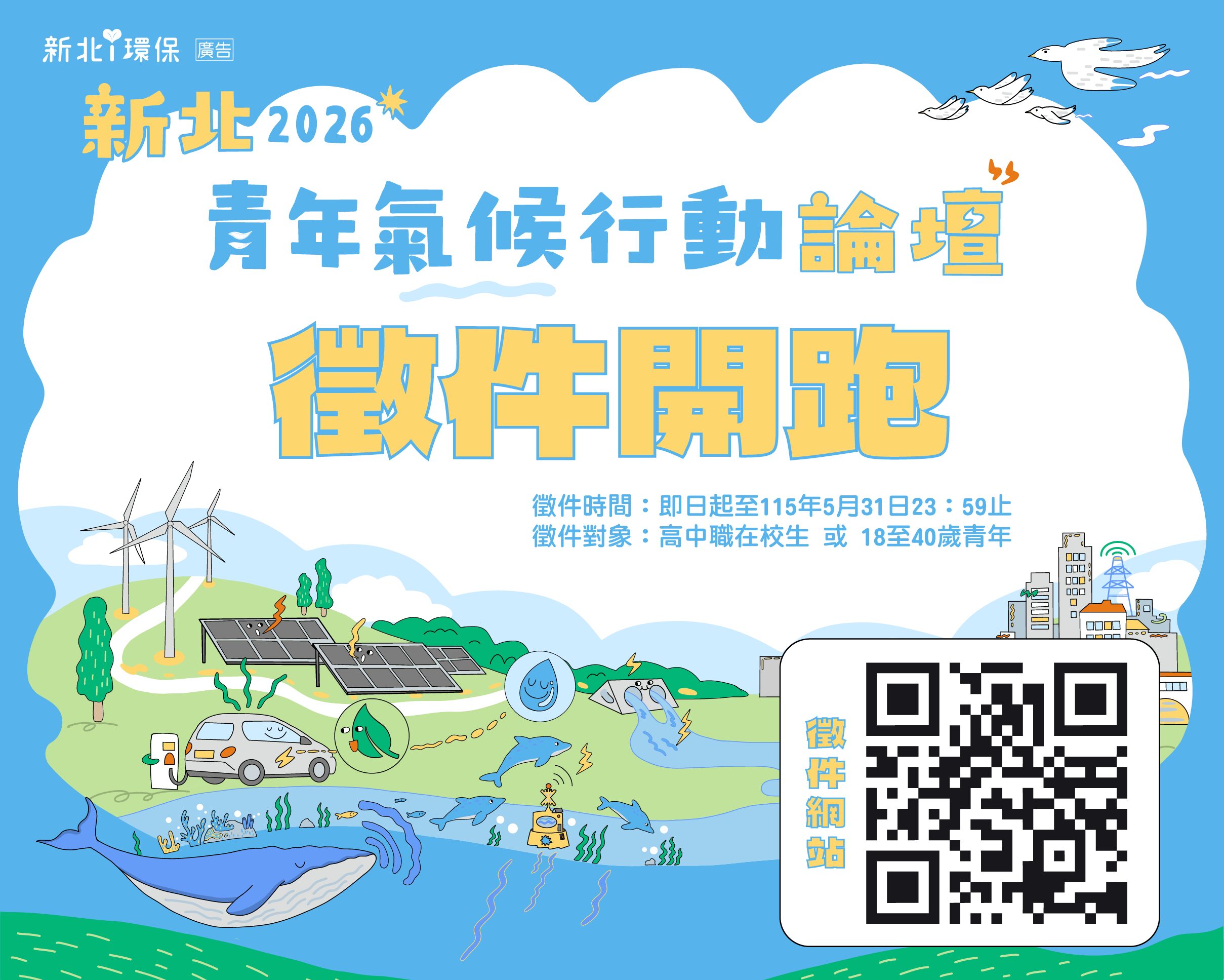 為鼓勵青年關注氣候議題並投入轉型力量,新北市環保局預定於今(115)年10月舉辦「新北2026國際青年氣候行動論壇」,即日起正式啟動「青年氣候行動徵件」活動,本次徵件主題涵蓋「能源設計」、「循環經濟」、「生態環境」及「群眾溝通」四大面向,邀請全國高中職學生及18至40歲青年組隊提案,將創意轉化為實際的氣候解方。