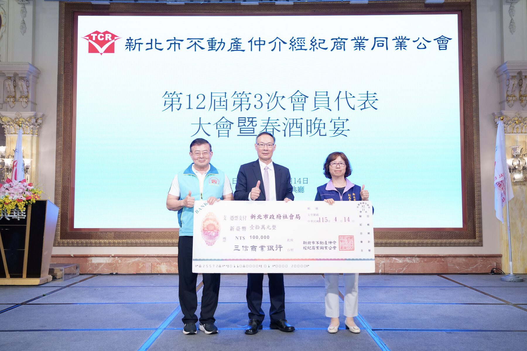 新北市不動產仲介經紀商業同業公會長年關心社會公益,日前在新莊典華餐廳召開第12屆第3次會員代表大會時,響應新北市好日子愛心大平台,由理事長林平川代表捐贈10萬元,做為新北市家外安置兒少支持服務計畫,社會局副局長許秀能到場代表受贈,並回贈侯友宜市長的感謝牌,地政局長汪禮國和經發局長盛筱蓉亦到場致意。
