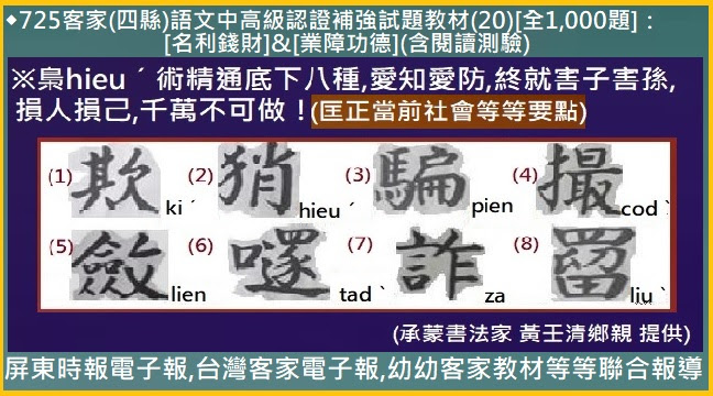 1欺kiˊ詐za:包括(欺 騙 斂 詐 撮cadˋ罶)等如下八種梟術。2蟑螂:黃蚻cad;指各行各業 以八種梟hieuˊ詐財的人。3拖把:指拖鞋。4備妥: 先準好勢se。5該員:那個人員。6忽略:一時無注意到。7領了 :領liangˊ了ngeˇ。8來讓:來使得。9上個月: 上隻zagˋ月。10要回來了:拿轉來了ieˇ。11疑似:懷疑 ngiˇ相似sii。12給他:分bunˊ佢giˇ。13後續: 後來継續xiug。14一天:一日。15中午:當晝zu。16列 了:列lied了leˇ。17過了幾天:過了veˇ幾日。18找 我:尋qim𠊎ngaiˇ。19不好?:唔(毋)mˇ好係meˇ ?。20玩不贏:拼bia唔(毋)mˇ贏。21檢舉了:檢舉gi ˋ了ieˇ。22有些事:有兜deuˊ的ve事。23真的: 真的ne,有影iangˋ。24我與他:𠊎ngaiˇ同佢giˇ 。25過程:過go程cangˇ。26站在:企kiˊ在cai。 27沒錯:無(冇)moˇ唔(毋)mˇ著cog。28這裡面:這 iaˋ肚裏。29縱使:賭断真。30跟告他:去告go佢。31也 要:也愛oi。32周旋:糾giu纏canˇ。33忙碌:無( 冇)moˇ閒。34掉入了:跌diedˋ入了beˇ。35陷阱: 計gie調tiau。36猖獗:猖congˊ獗kied( kiad) ,敗壞fai流行。