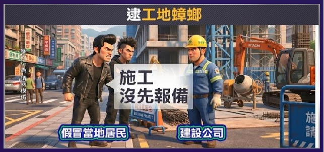 5▲烏龜&蟑螂-5犯罪集團假藉在地居民名義, 用施工沒先報備等理由,向建設公司索討高額的地方處理費(圖/ 民視新聞AI示意)(2026/4/14)。
