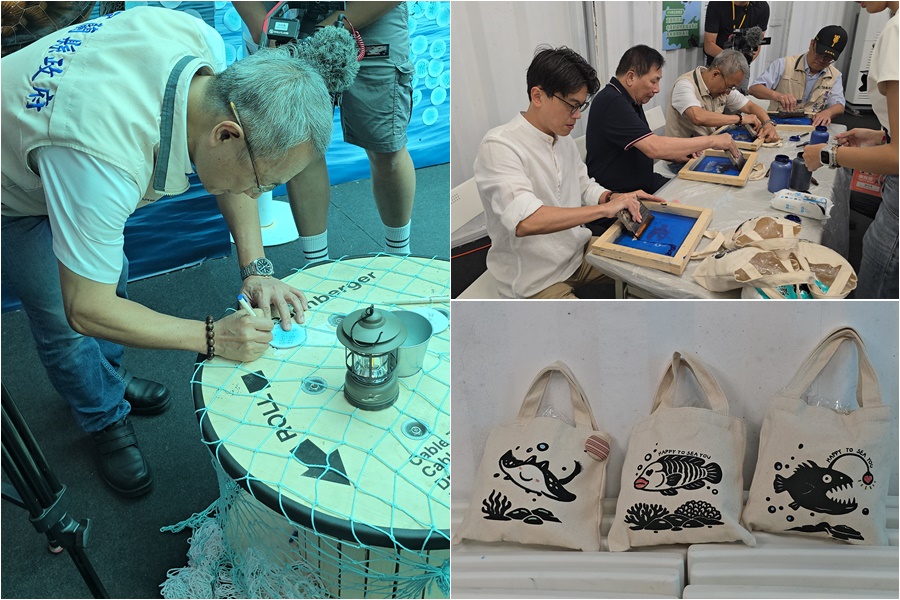 代理縣長林茂盛等人還親身體驗絹印DIY,將海洋生物燈籠魚等圖案轉印於布面,透過手作過程深刻體悟海洋議題與日常生活的連結,眾人並寫下許願卡,許下對人類與海洋的願望,留下此行的見證與紀念。